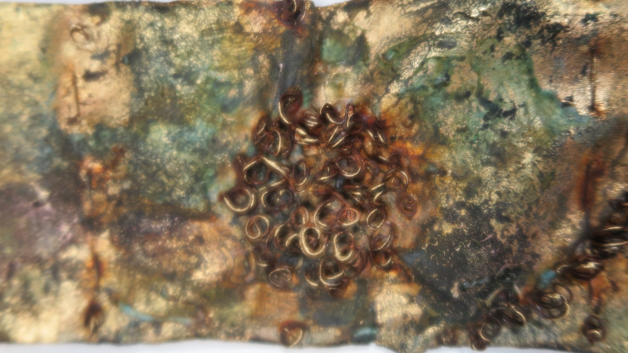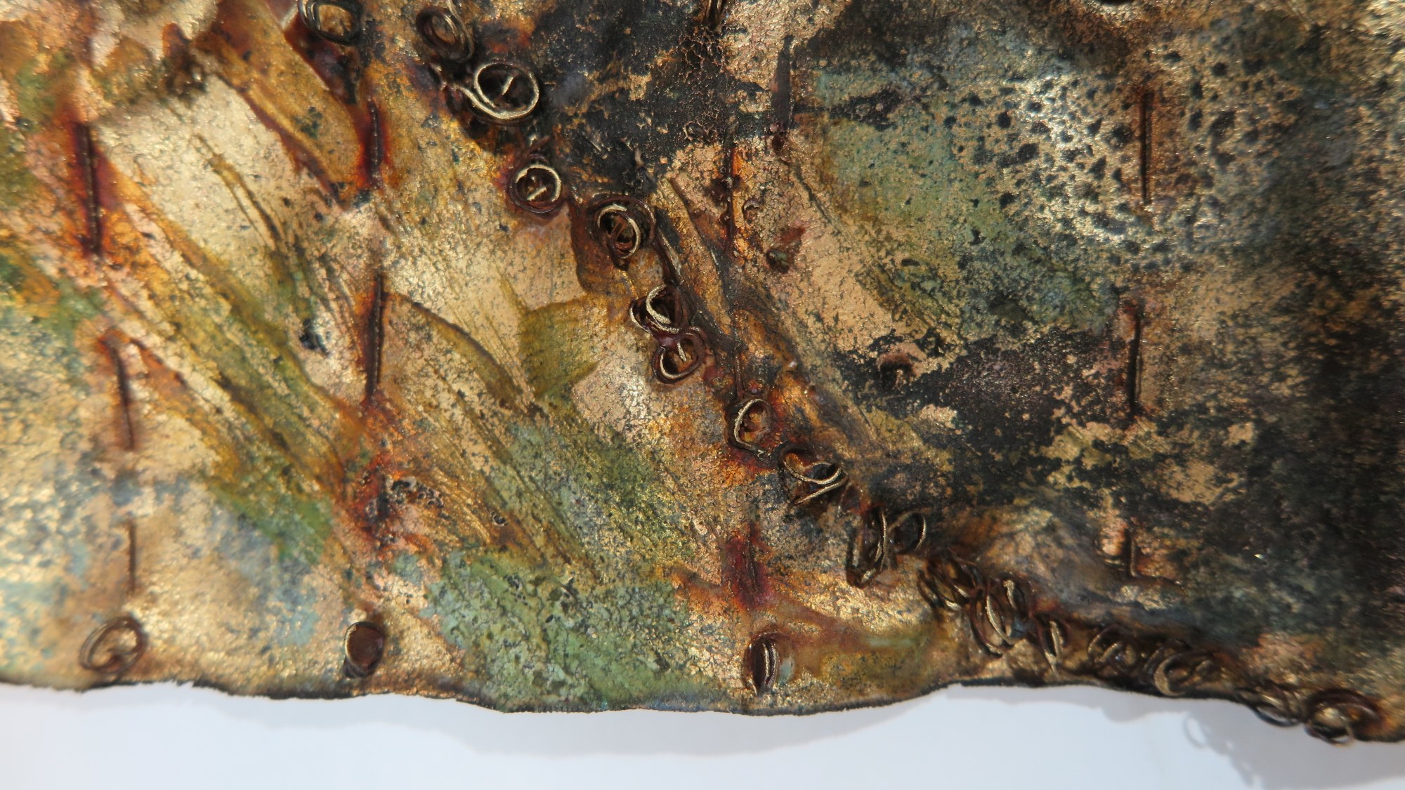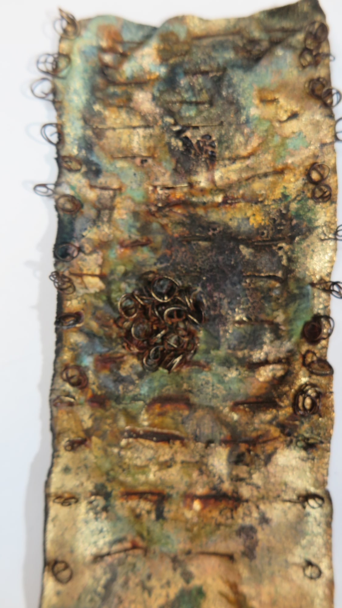 Wall hanging with textures in wire, encrustations of oxide over a gilded fabric.