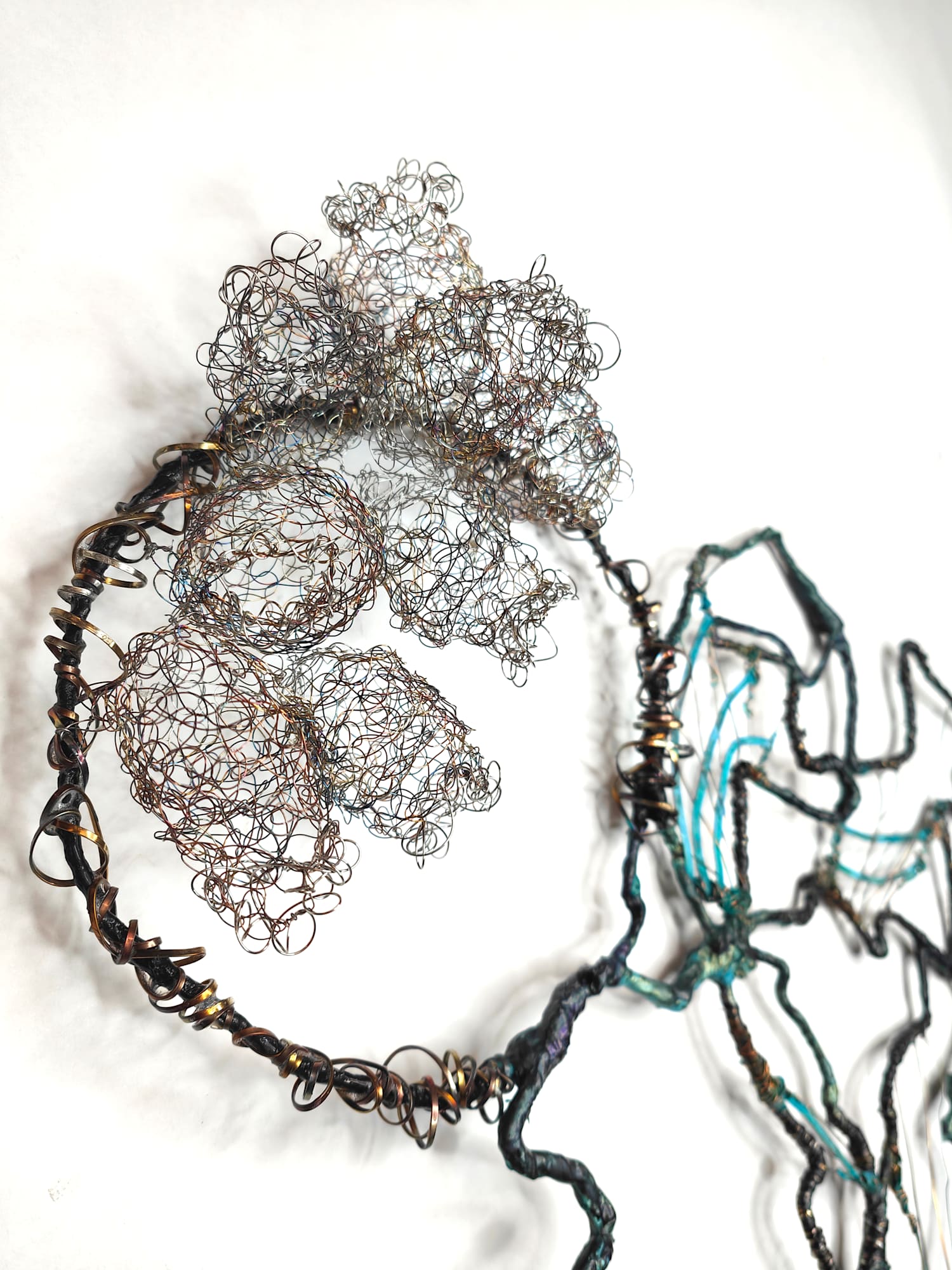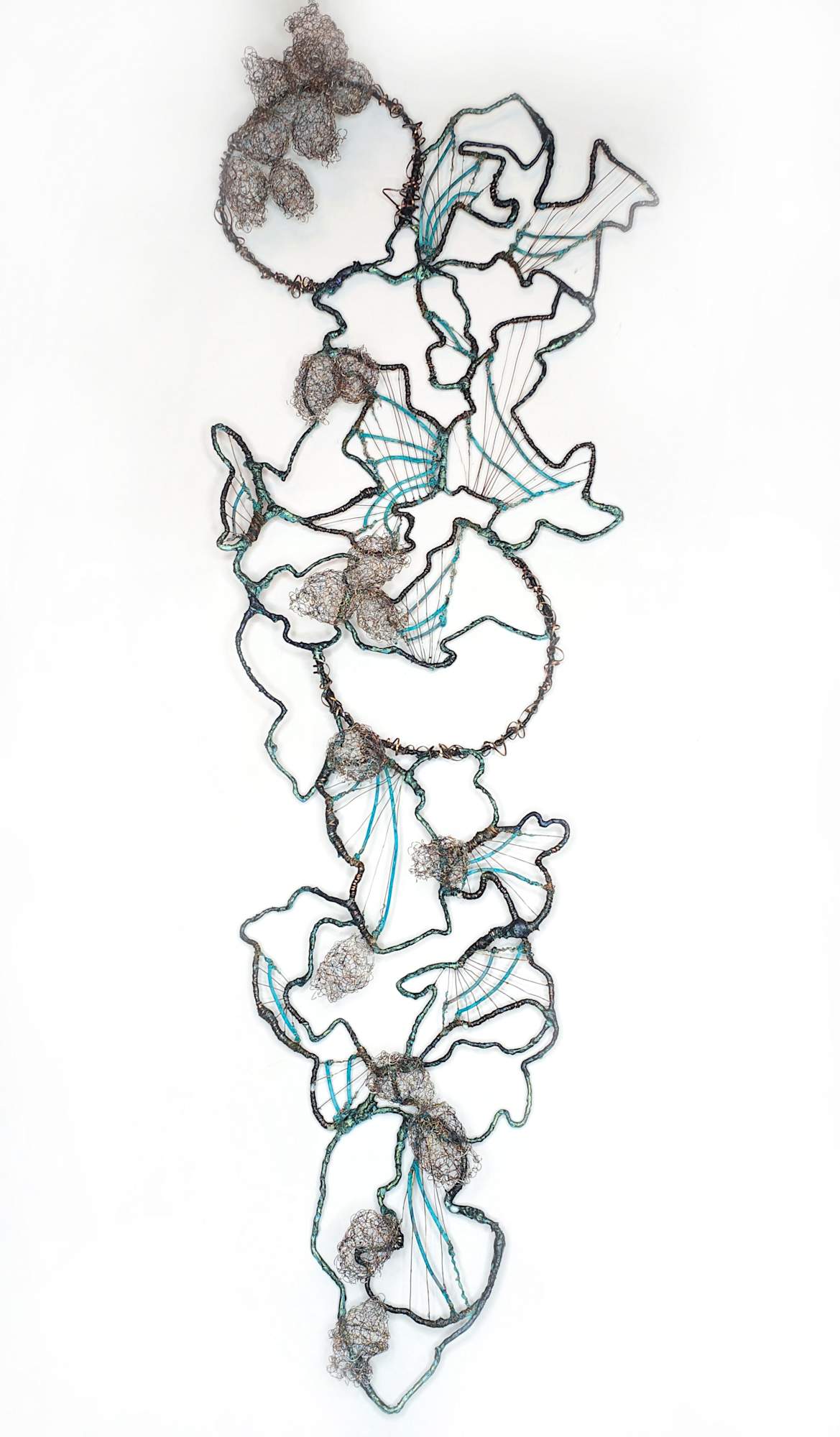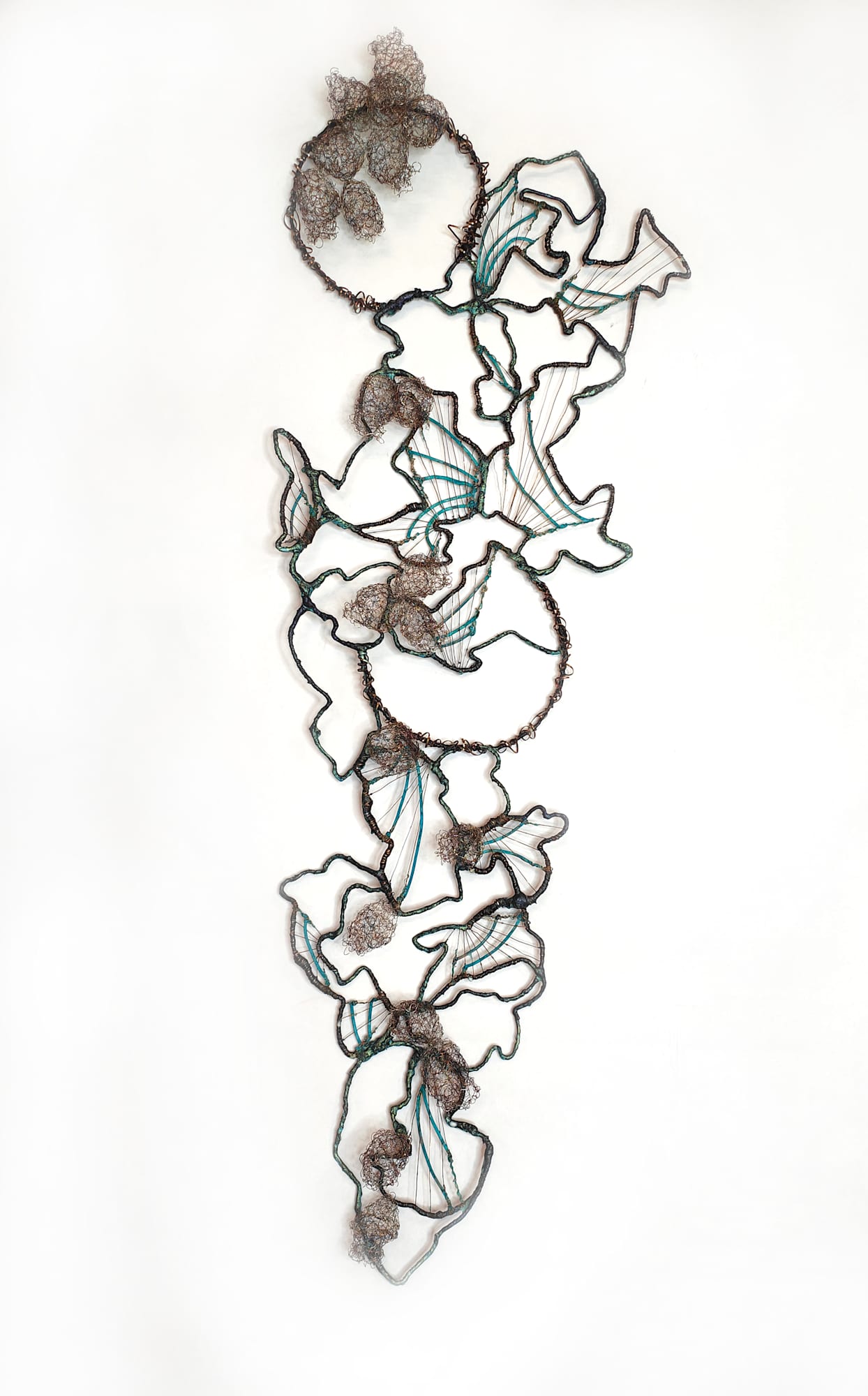 This work reflects on the shared yet unseen connections between all living things, invisible networks of energy weaving through life. Wire cup-like forms are scattered sparks of light within the piece, like the bright, ever-changing glints of reflected sun or moonlight on moving waters, symbolising moments of memory we cherish and nurture. Other twisted wires form a flowing structure and framework that invokes the essence of life's interconnectedness.