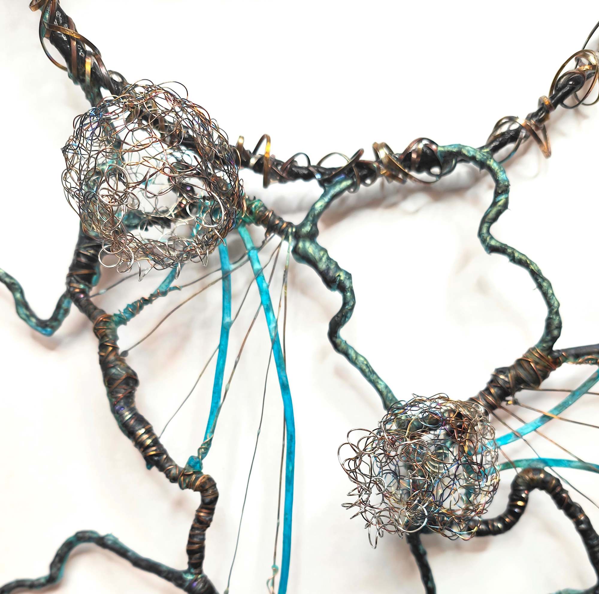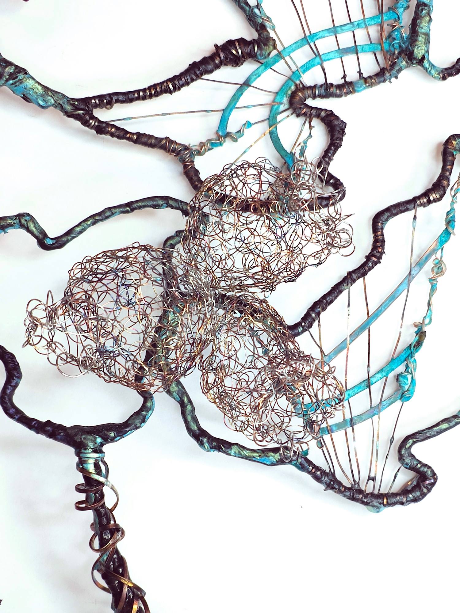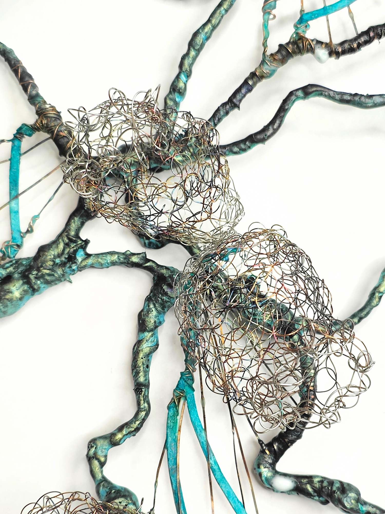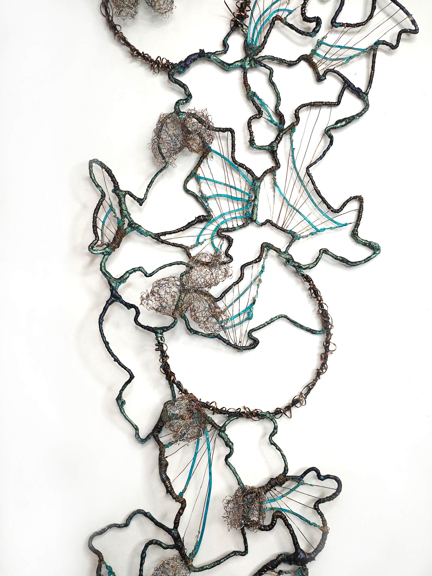 This work reflects on the shared yet unseen connections between all living things, invisible networks of energy weaving through life. Wire cup-like forms are scattered sparks of light within the piece, like the bright, ever-changing glints of reflected sun or moonlight on moving waters, symbolising moments of memory we cherish and nurture. Other twisted wires form a flowing structure and framework that invokes the essence of life's interconnectedness.