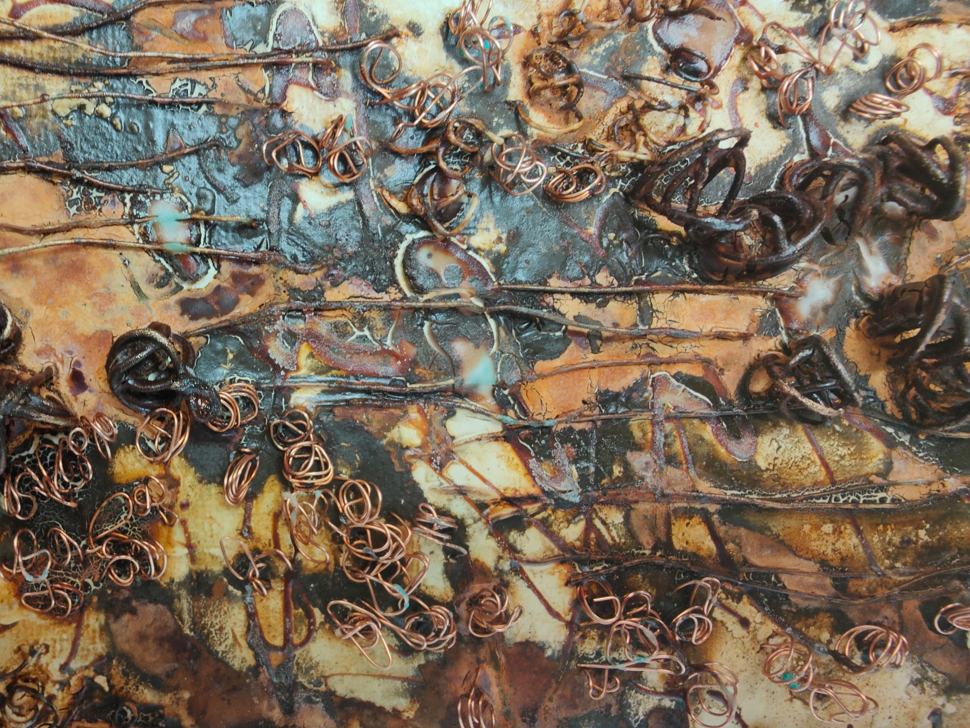 Swirling stitched wire textures and oxide paint flow over a rich gilded surface.