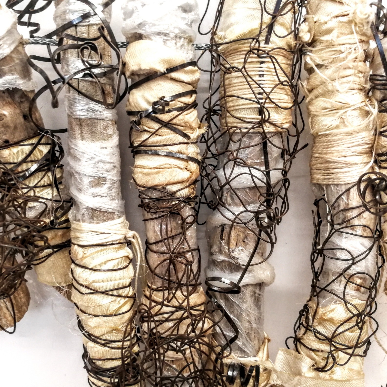 Weaving together driftwood, fibres, wires and textiles, evoking a sense of resilience, connection, and the weathered beauty of nature's rhythms and the passage of time.