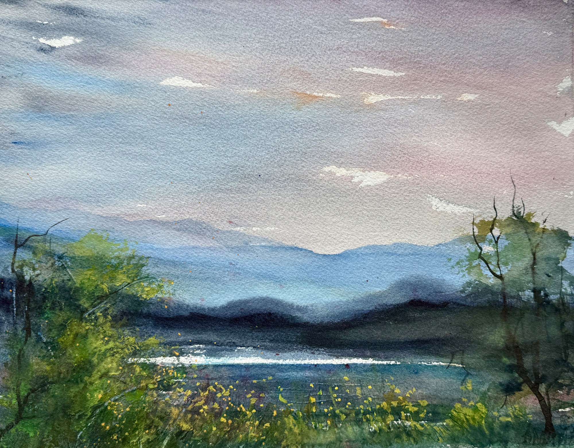 Morning Hues on Highland Waters" is a captivating 11x14 watercolor on paper that embodies the tranquil beauty of nature's awakening. I attempted to capture the serene essence of dawn as it unfolds through the mountain valley.