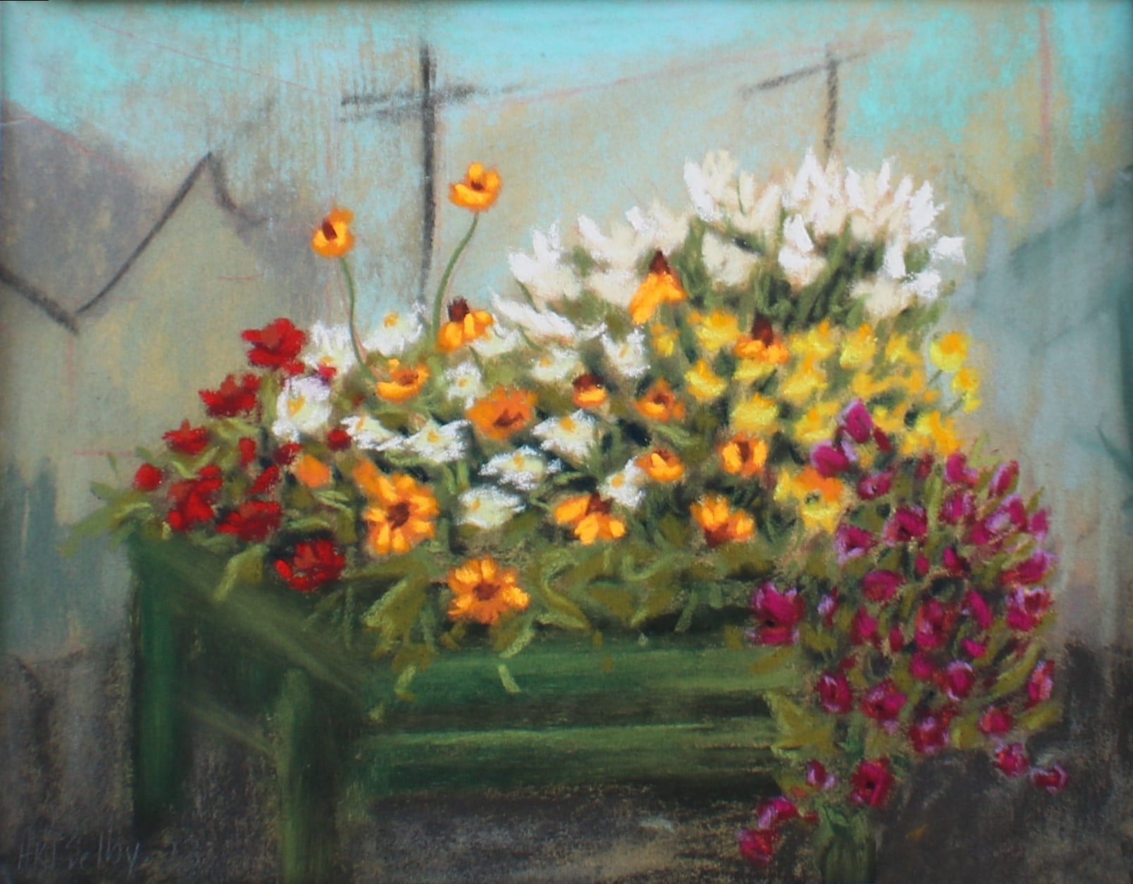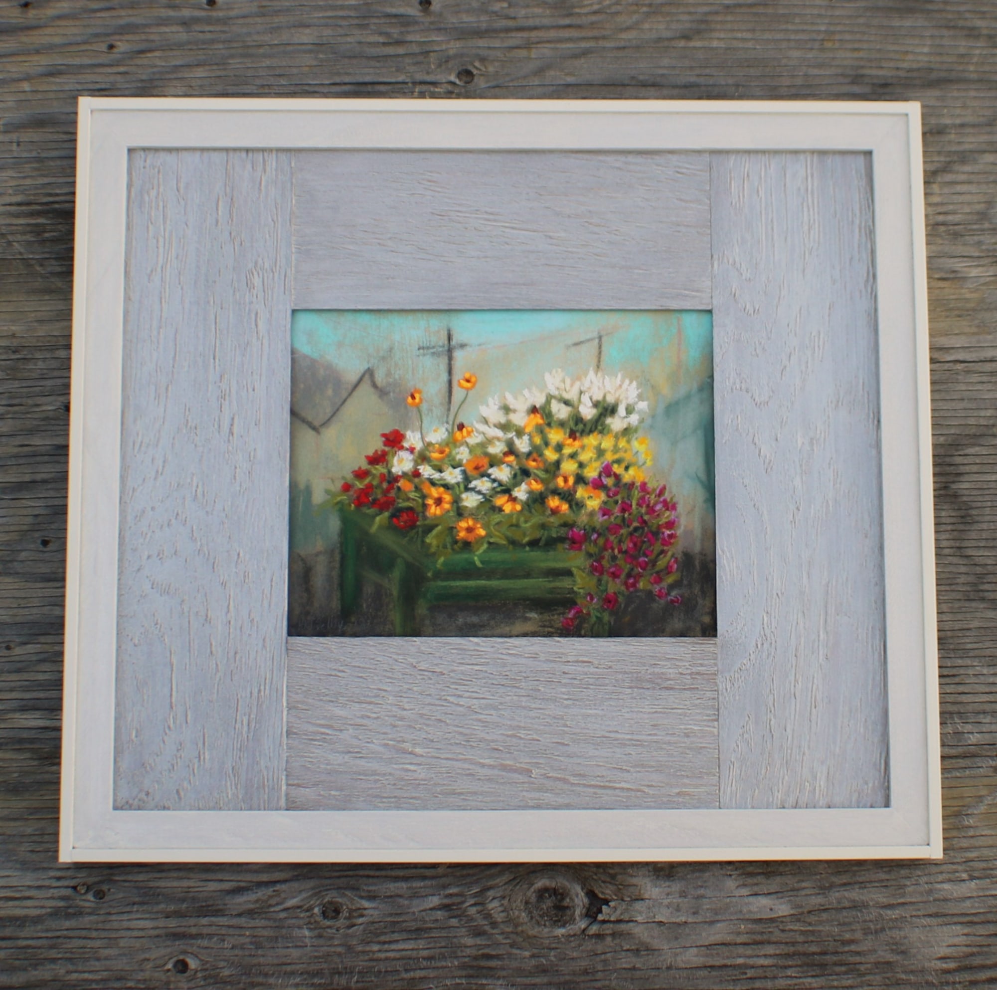 A Plein air painting in late summer at Bernice's Bakery, a short walk from my home and a local Icon. The painting is framed out of salvaged lumber and paints and stains.