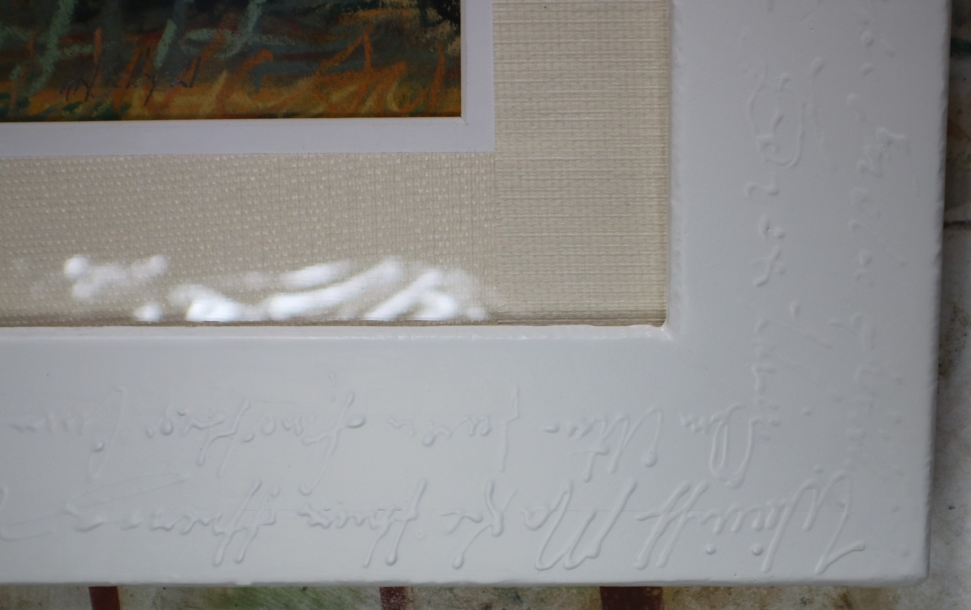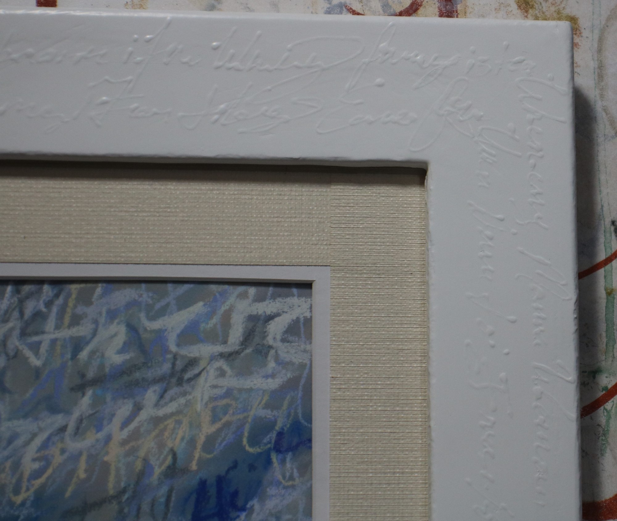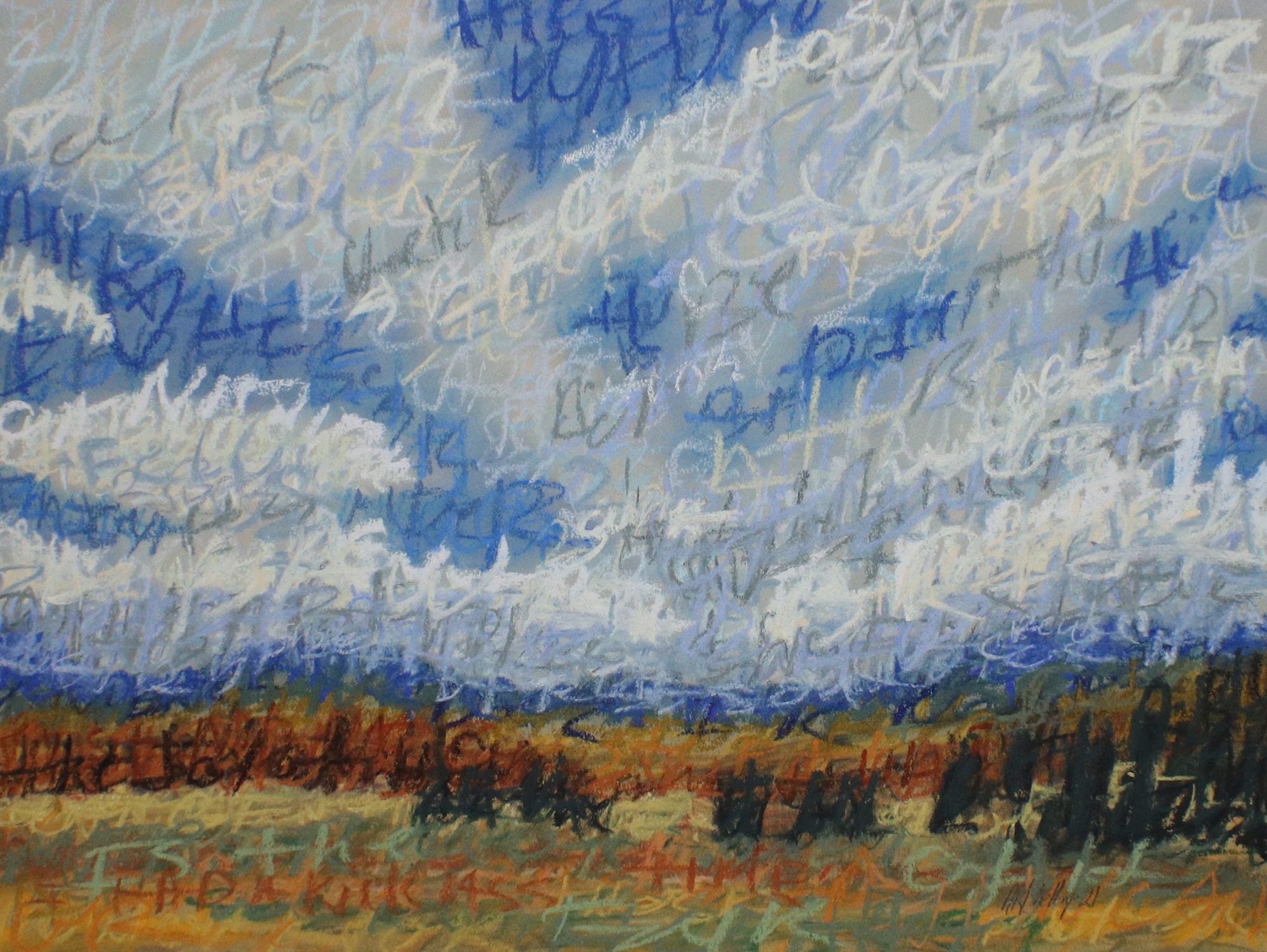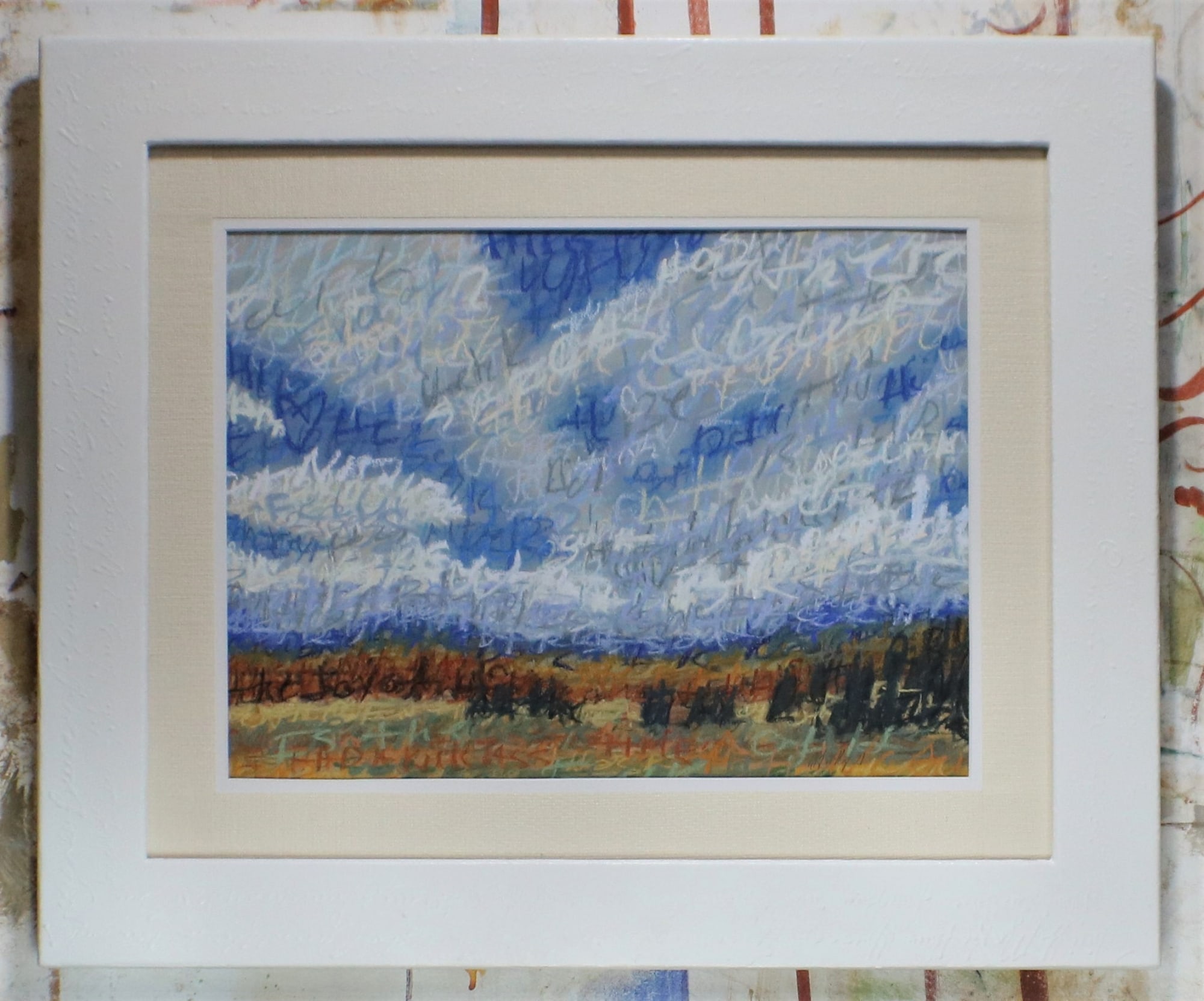 Those who know me know that I am fascinated with abstract writing. I loved playing with this in soft pastels, which led to my experimenting with cognitive therapy. I start this process by writing out the negative thoughts I am having with pastel; I smear them into the background to create an underpainting, then I layer positive thinking words on the top for the rest of the details.
