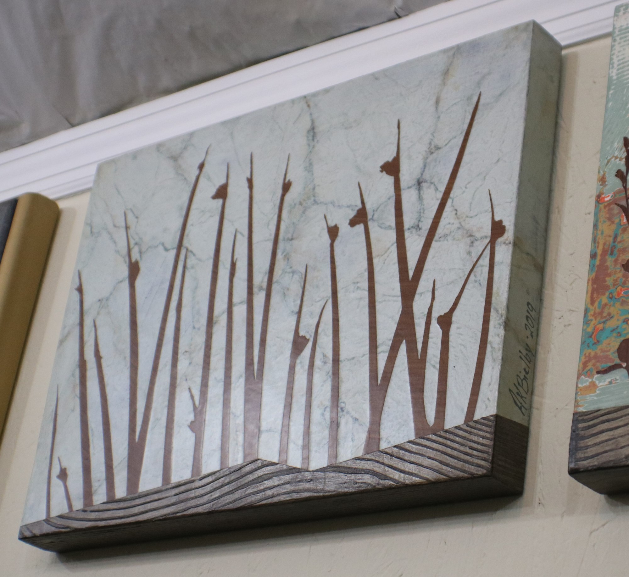 This piece is painted on a recycled bifold door. All edges are painted with the image wrapping around. The Idea of this piece comes from a camping/fishing trip sitting in camp by the reservoir looking down through this grass at the water. Patterns and shapes are inspired by Montana's river rock, scenery, and woods.