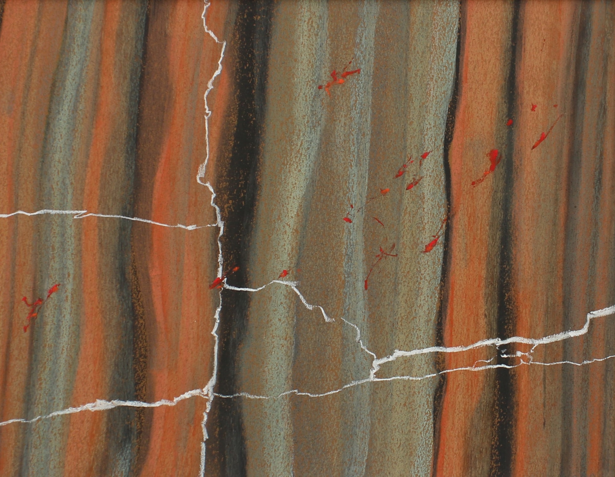 The Rattlesnake Creek Dam residency was to take time for myself, take time for health and art and spend time with something that I could relate to and learn from. In my art, I find myself constantly chasing a child-like mental clarity. This memory comes to mind when I was about 6 or 7, spending a summer's day at a lake smashing rocks with water to make a face paint. I worked all day loving the consistency and how the rock broke down, smearing it all over my body, not caring about anything but what I was doing. Something about rock beds and water systems makes adult stresses diminish. Looking at those surroundings of the landscape, insects, water flowing, plants, flowers, patterns in the river rocks then taking them to my art process gives me small adult moments of that childhood clarity of existence. I titled this one "Color Sliding Off my Fingers" because I just really got into the feeling and the sound of the pastel strokes going across the paper painting the patterns of the rock formations. Memorized by the effects of sliding one color over the other.