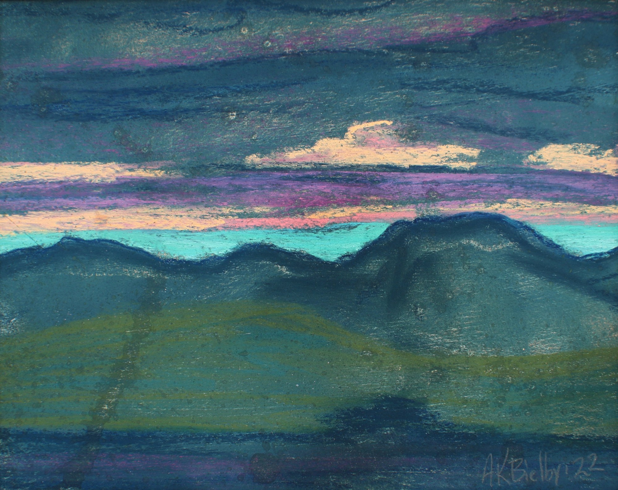 This piece was painted with a handful of others like it after an early fishing excursion with my husband. The sunrise was breathtaking and unique that morning, with bright teal and orange-pink peeking through dense clouds and rolly sagebrush hillsides. The sun came out later that day and allowed me to quickly under-paint and pastel over several pieces of watercolor. I had fun laying them out amongst the sage bushes to ketch the sun.