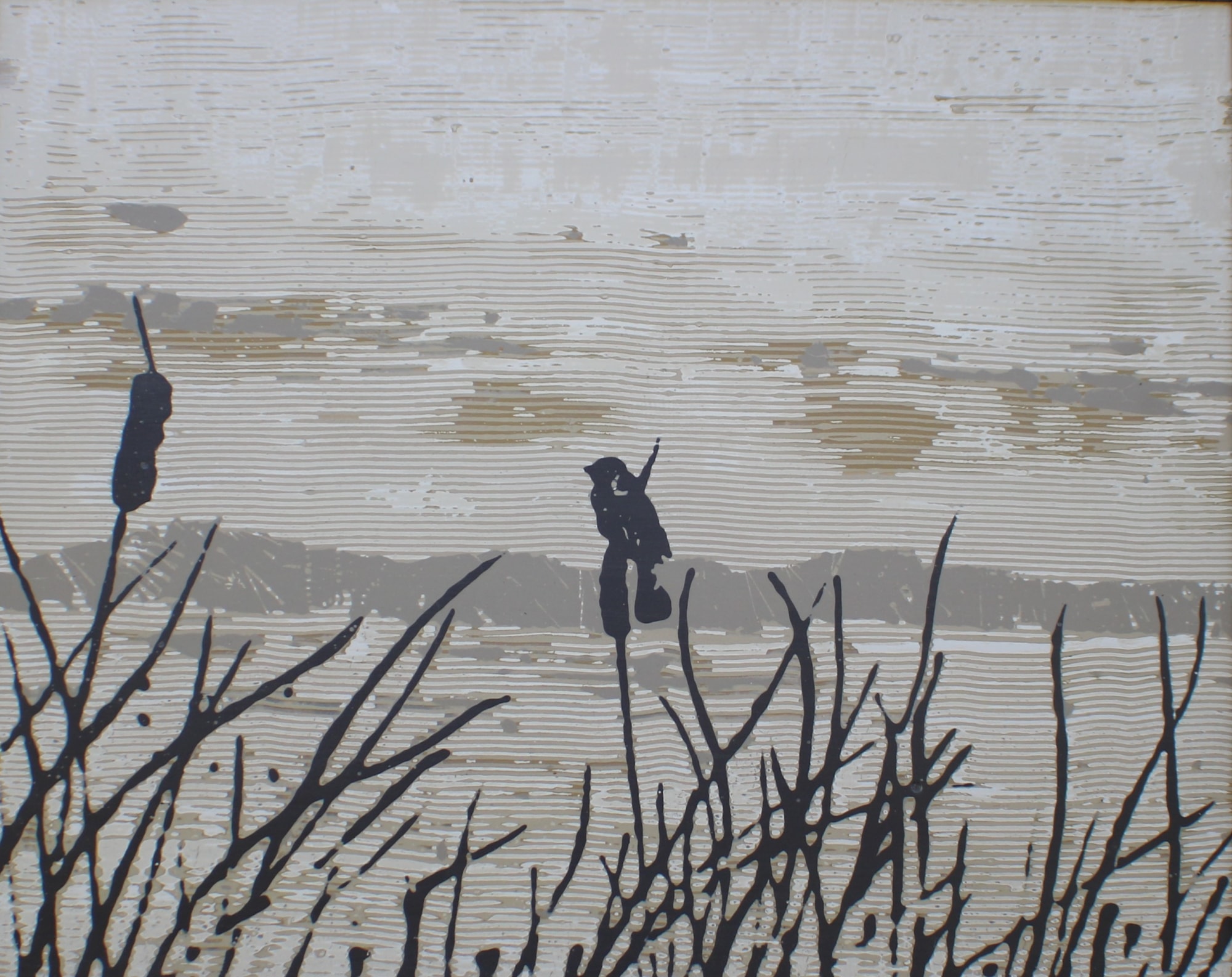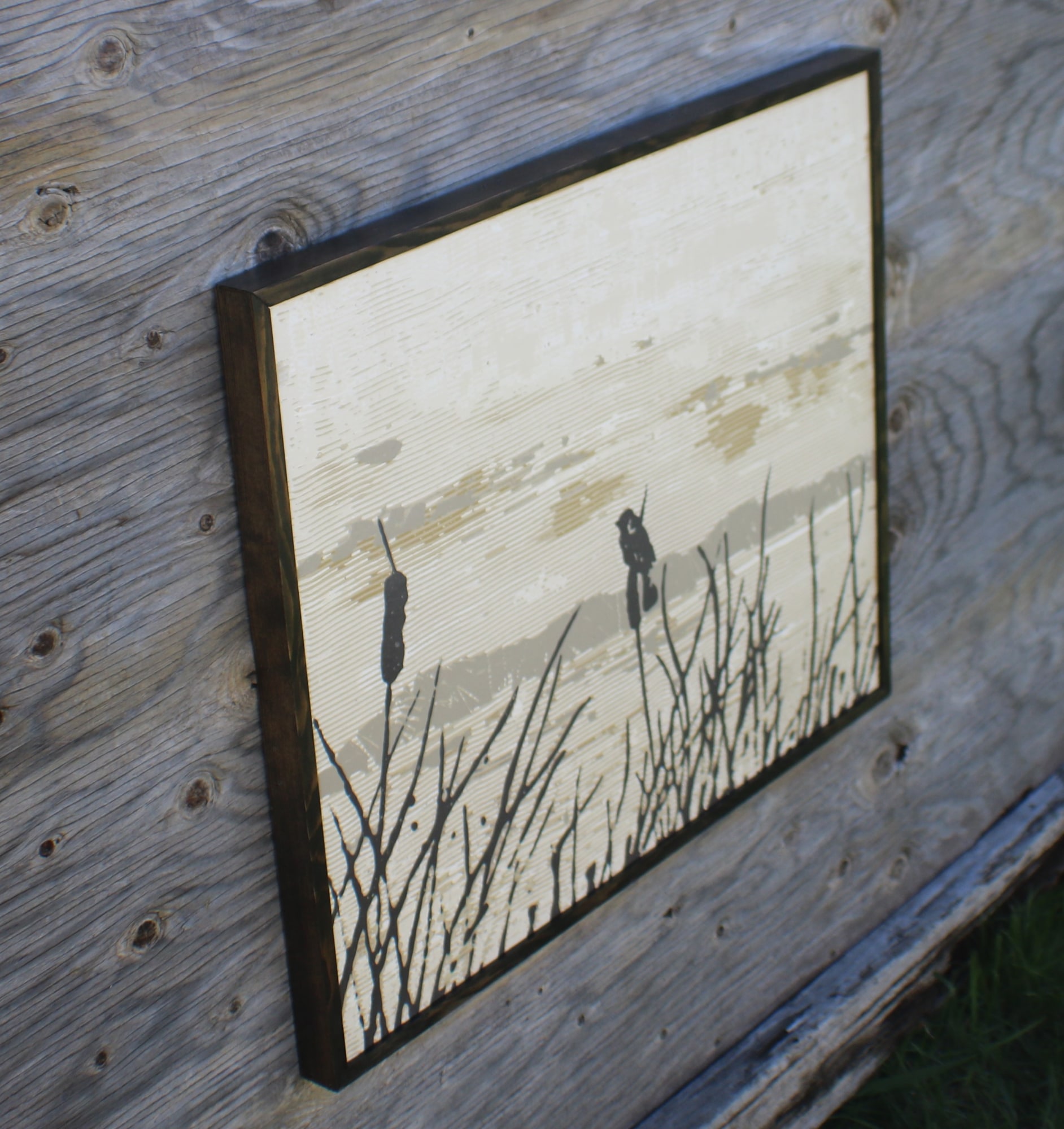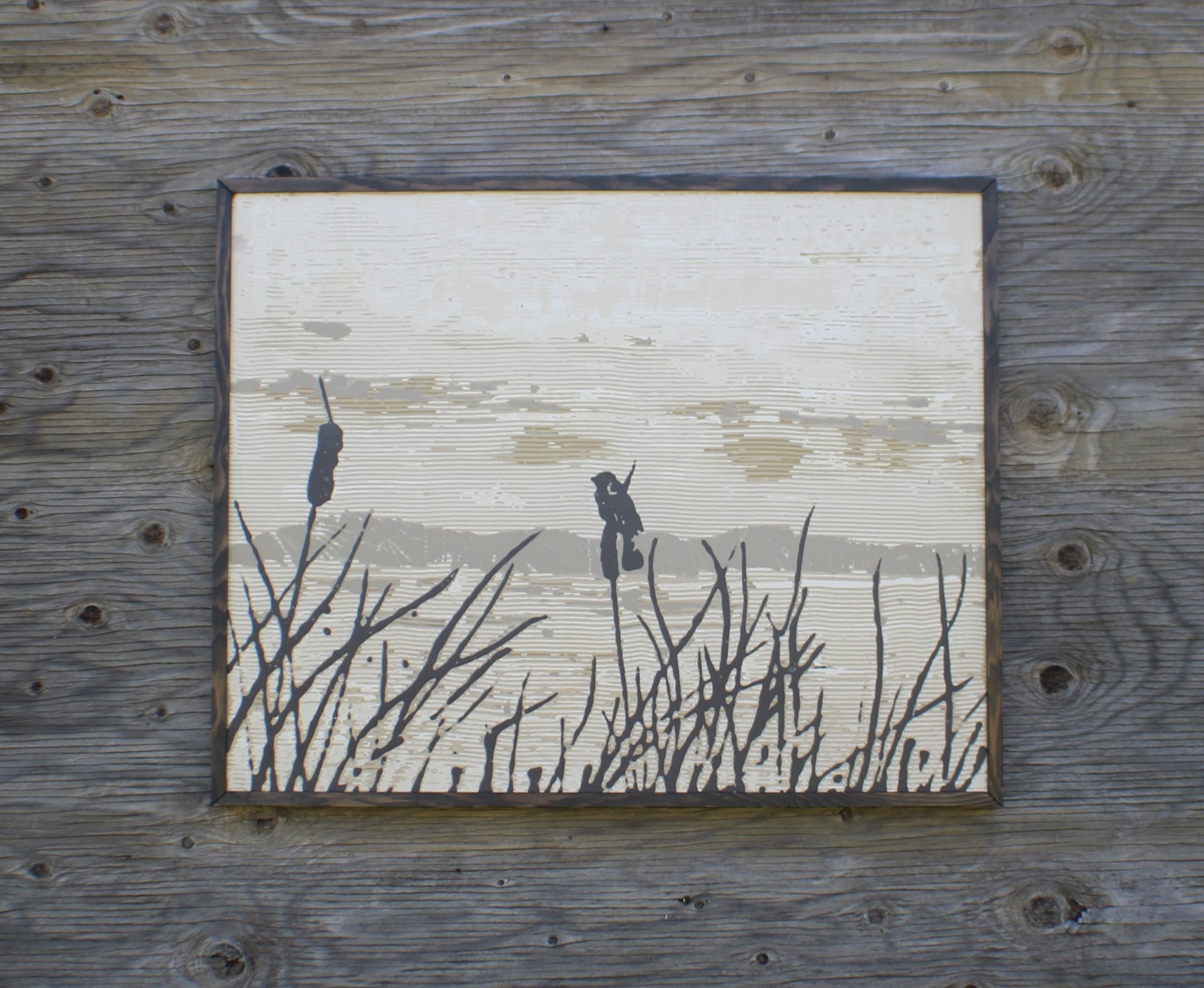 The female of a Red-Winged Black Bird, I wanted to salute her in her natural muted colors. The beauty of the male is great, but she was the one brave enough to come up close and pose for me to stop me and my kayak from getting any closer to her nest. I stopped, studied her, took some photos, and then backed away. Greatness in the ordinary everyday female. This painting is painted and framed out of recycled building supplies. I call this process paint weaving I mix paint and drywall mud together and layer it on top and next to each other then sand it down to reveal the image. It is then top-coated with a Flat Polly for protection.