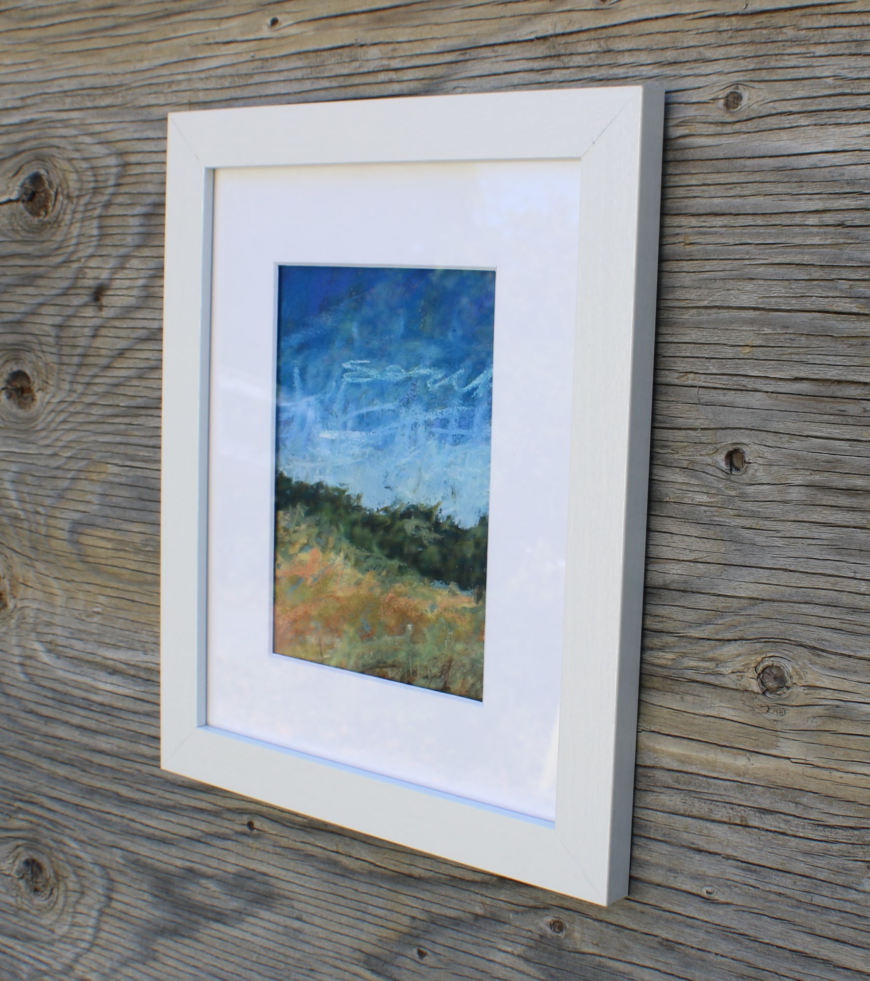 This view looks up a hillside in the Big Hole Valley, Montana. I go backpacking every year in September to ketch the fall colors and view wildlife. I practice cognitive behavioral therapy in some of my pastel paintings. I start this process by writing out my negative thoughts with pastels; I smear them into the background to create an underpainting. Then I layer positive thinking words on the top for my mark-making to build my image. This becomes a fun puzzle that moves my mind away from racy thoughts; my words change from a forced thought process to something more present and relaxed in creating the painting.