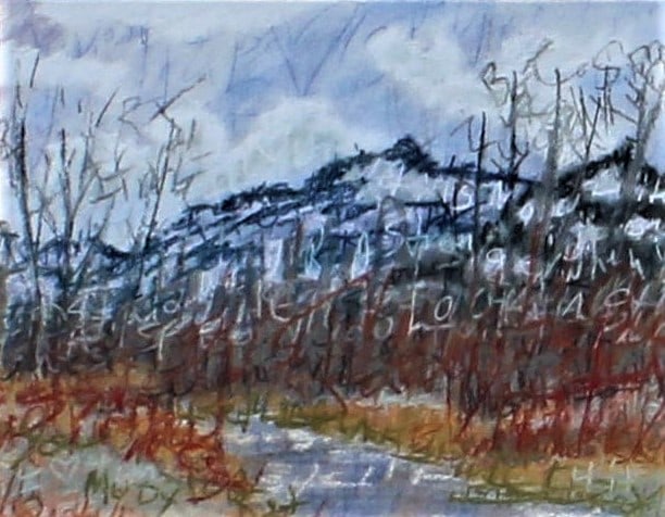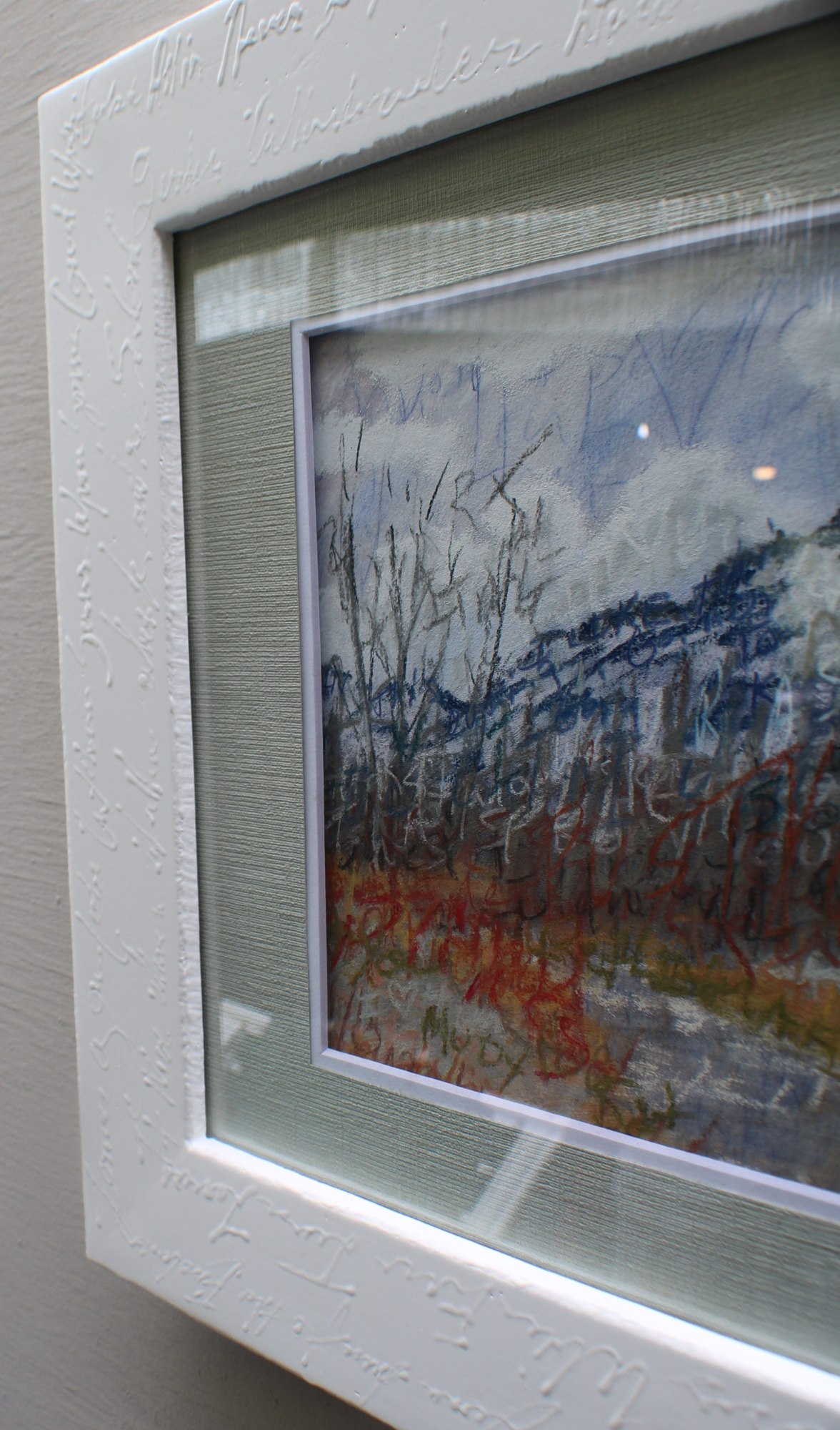Those of you who know me know that I have a fascination with abstract writing. I loved playing with this in soft pastels, which led to my experimenting with cognitive therapy. I start this process by writing out the negative thoughts I am having with pastel; I smear them into the background, then I layer words of positive thinking on the top.