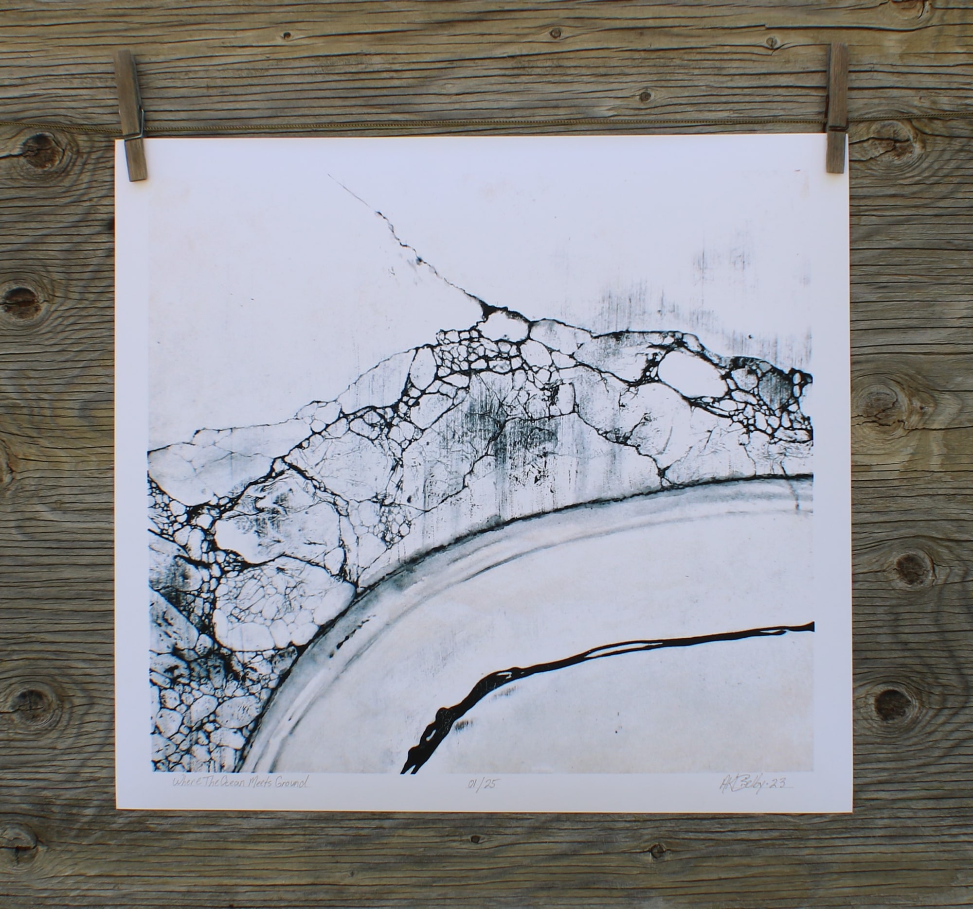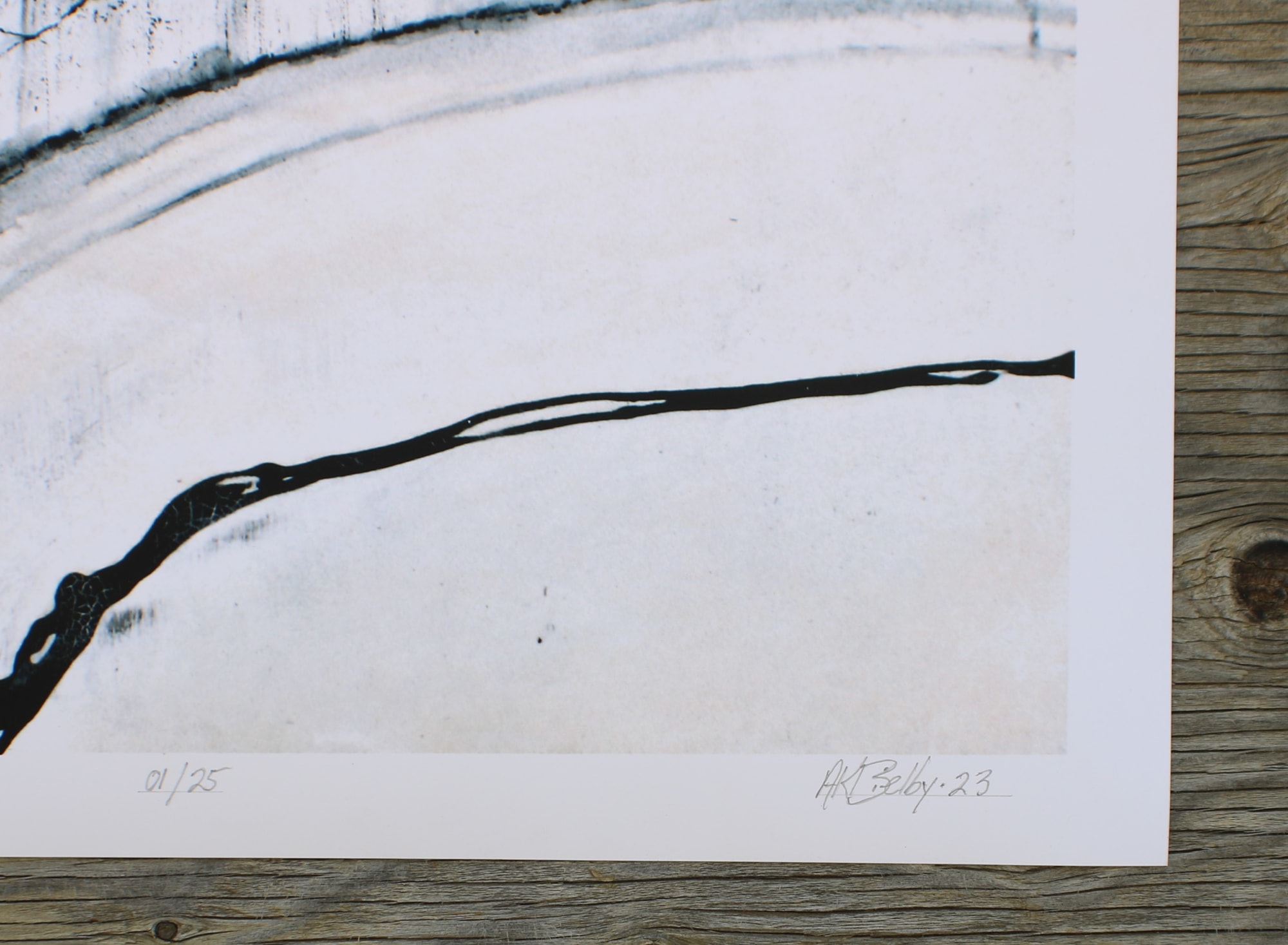 The hand-signed prints image is 14.5"H by 16.5"W inches with a 1-inch white border around the print and is signed just below the image in the white border. Then the print is matted by the artist with a bevel opening cut. With just enough white border showing around to show the signature of the artist. Print is mounted on a mat board with archival hinge strips for ease of removal. Ready for a frame! Mat comes to 19.5"H x 20.75" W