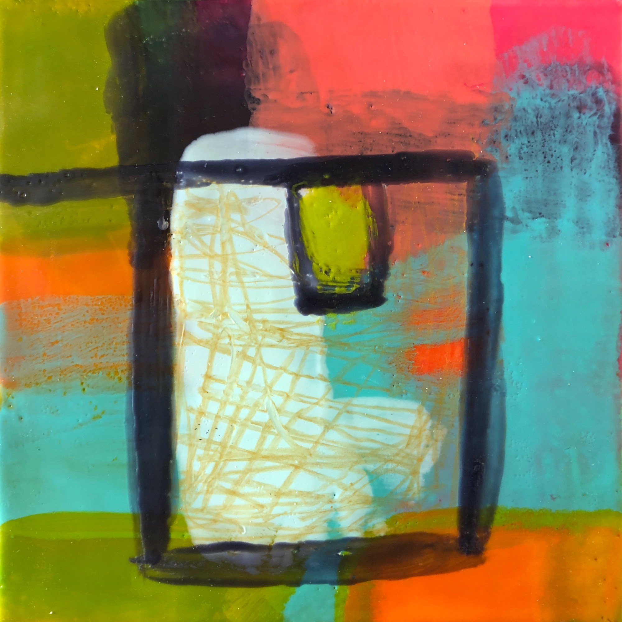 Encaustic painting on a birch cradled panel, framed in a black floater frame.