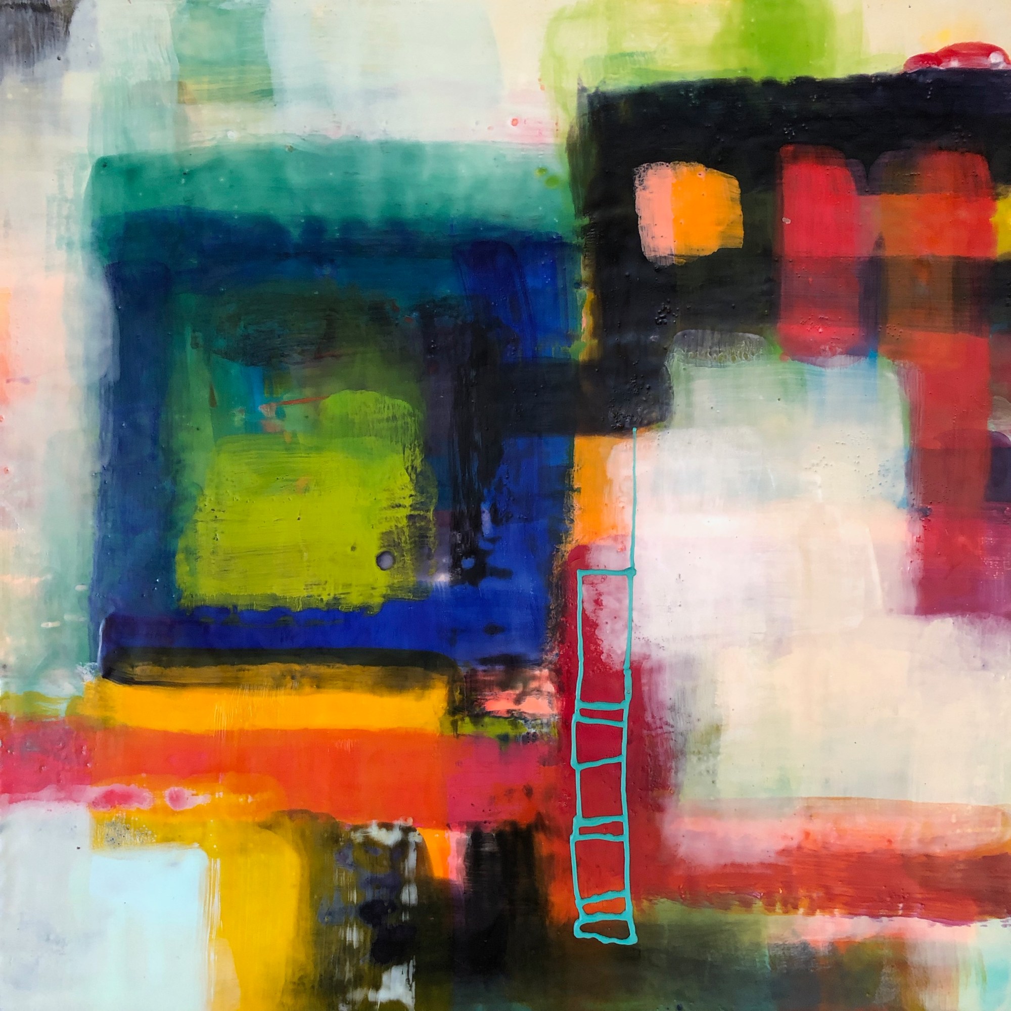 Encaustic painting on a birch cradled panel, framed in a black floater frame.