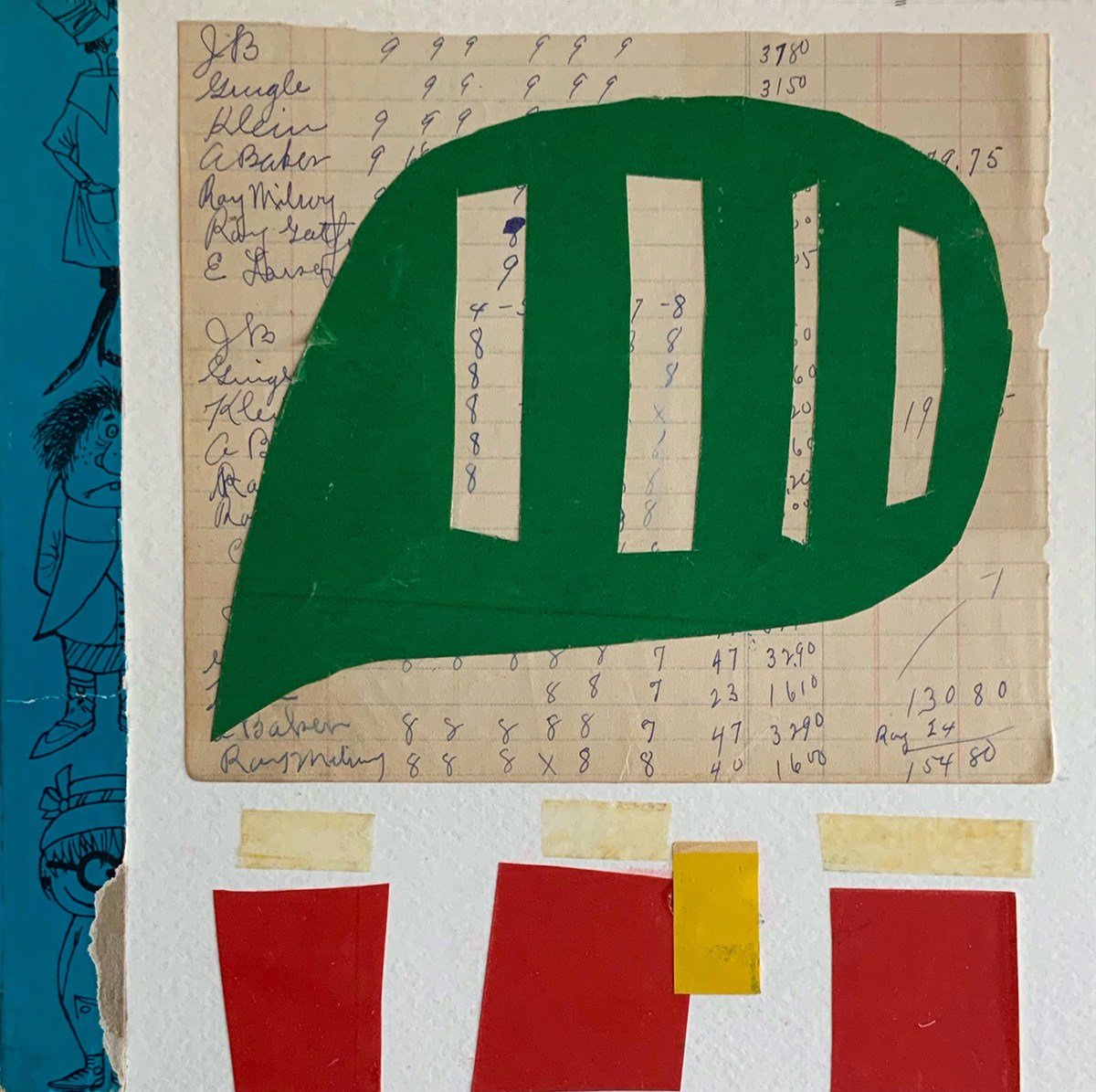 My collage works are abstractions of found story in discarded vintage ephemera. I work intuitively, so often a story emerges after drawing randomly from my storehouse of 1910-1960s papers and boxes salvaged from their landfill destination. Working quickly so as not to overthink, colors, shapes and patterns emerge often influenced by recent experiences. The aged materials tied with these recent influences lend that mind to a thread that runs through the human story.