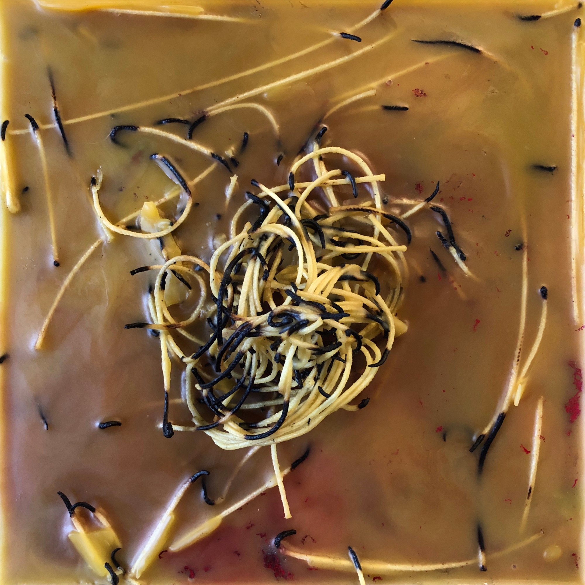 Materials: a cast away painting from earlier years, remnants of Greek Orthodox prayer candles, salvaged candle wicks, memories of childbirth, fire, attachment pain, and good intentions.