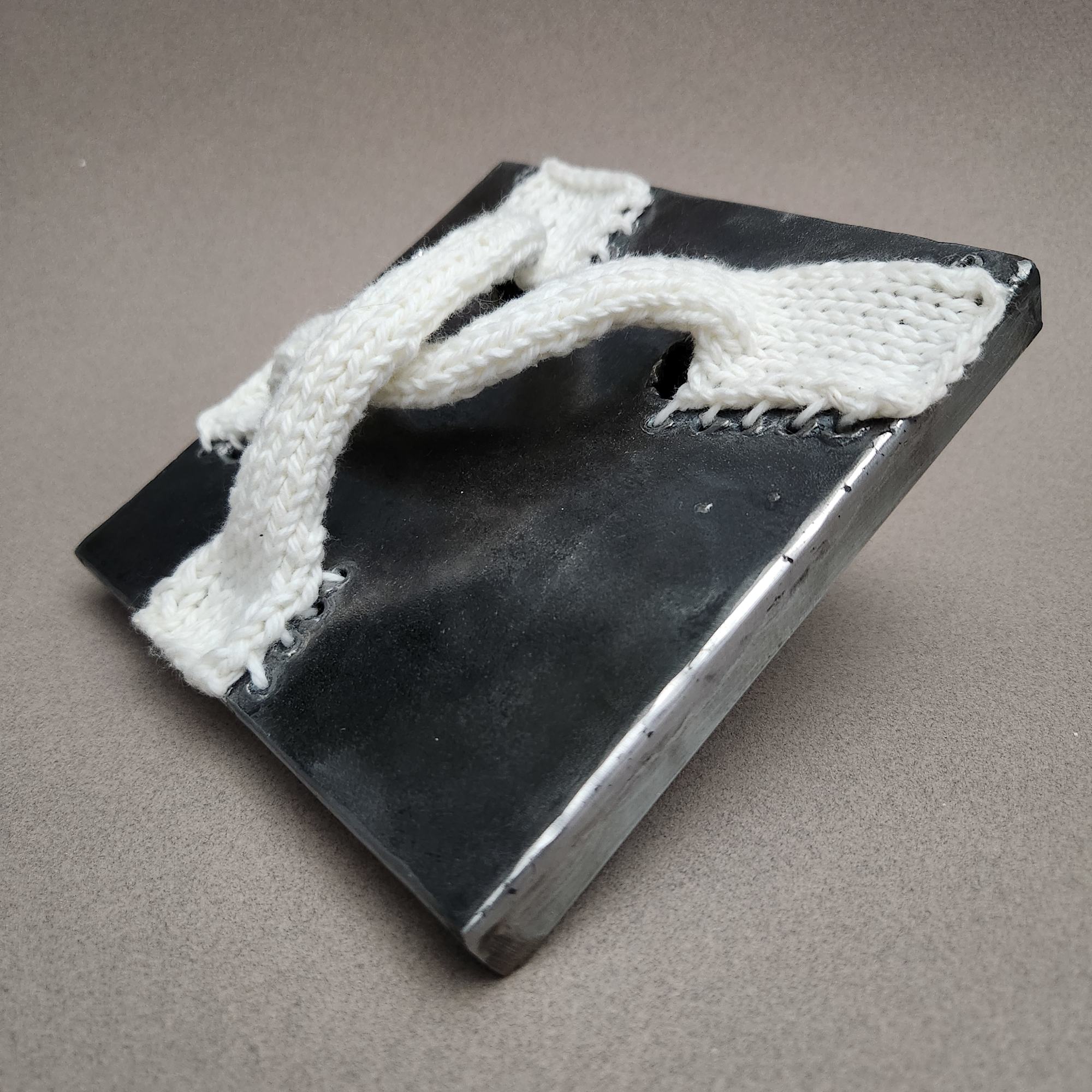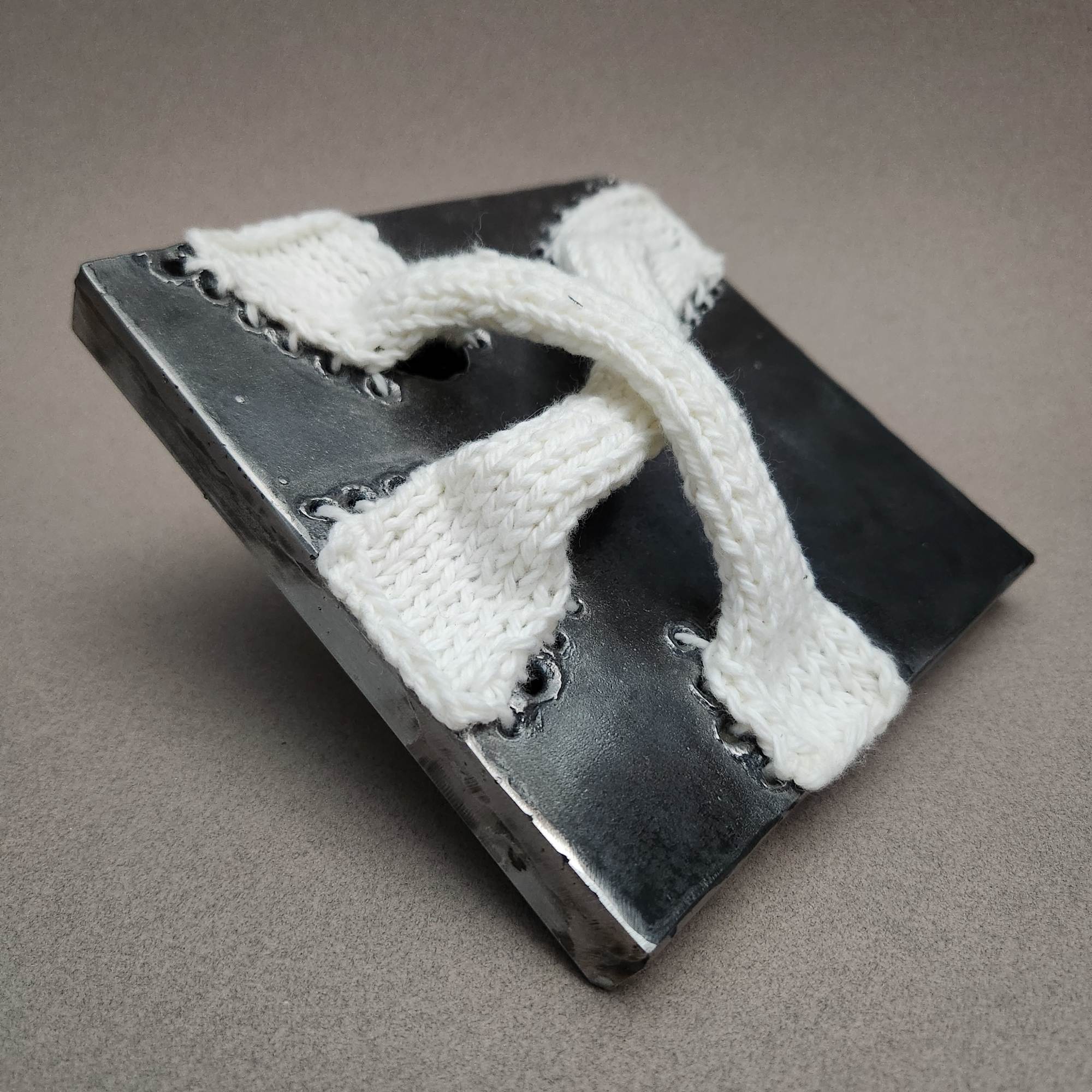 This piece is #1 of 30 in the series of work I created for the 30x30x30 Exhibition for Var Gallery in 2024. The challenge was to for every artist in the show to create 30 pieces of work in 30 days. We started on January 1 and created one piece for day with the requirement that all 30 pieces had to be completed by the end of the month. All pieces in the exhibition had a maximum size of 6 x 6 x 6 inches. My goal for this project was to develop new ideas for how to combine yarn and steel; the breakneck speed with which I had to make work meant that I didn't have time to overthink the ideas--I just had to try them and see how they turned out. Every piece taught me something about my own work and my own process. Every one was relevatory in some way. While I don't believe all of them are true successes, I only really see a couple of them as disapointments. And even in those cases, the disappointment stems from the execution, not the idea itself.