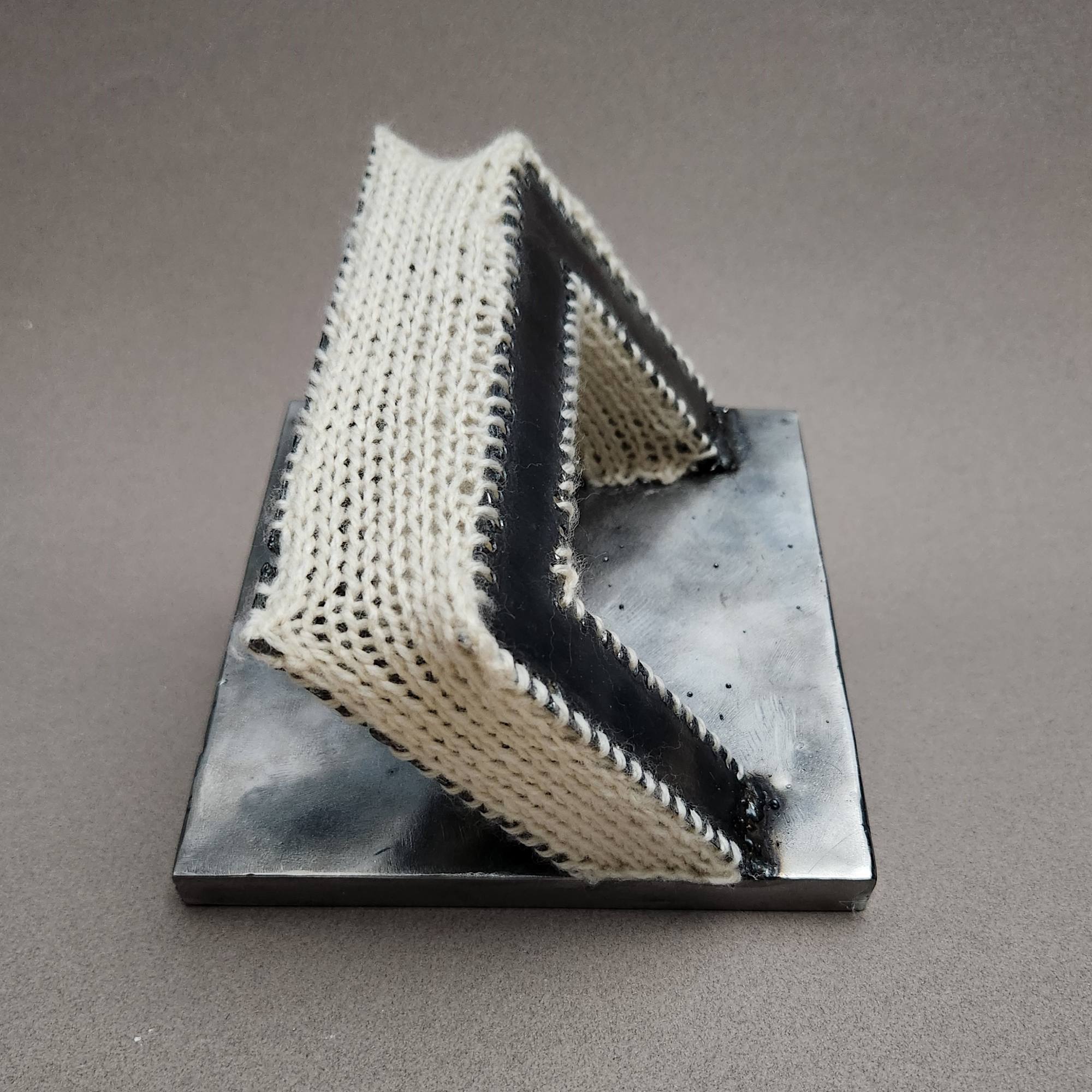 This piece is #21 of 30 in the series of work I created for the 30x30x30 Exhibition for Var Gallery in 2024. The challenge was to for every artist in the show to create 30 pieces of work in 30 days. We started on January 1 and created one piece for day with the requirement that all 30 pieces had to be completed by the end of the month. All pieces in the exhibition had a maximum size of 6 x 6 x 6 inches. My goal for this project was to develop new ideas for how to combine yarn and steel; the breakneck speed with which I had to make work meant that I didn't have time to overthink the ideas--I just had to try them and see how they turned out. Every piece taught me something about my own work and my own process. Every one was revelatory in some way. While I don't believe all of them are true successes, I only really see a couple of them as disappointments. And even in those cases, the disappointment stems from the execution, not the idea itself.