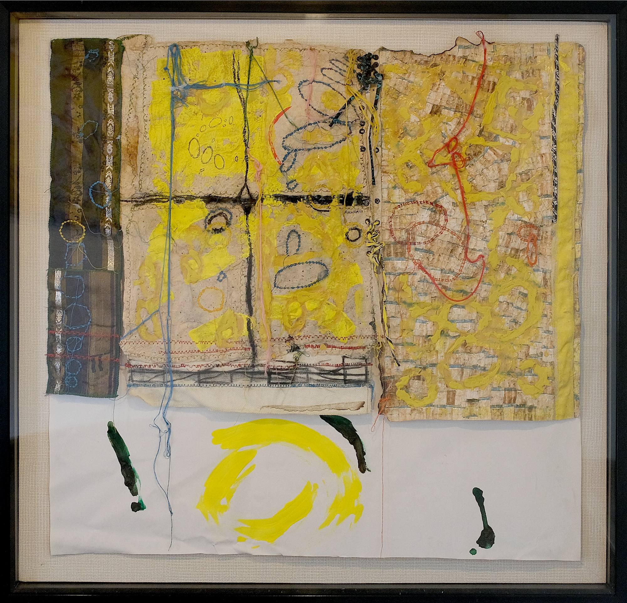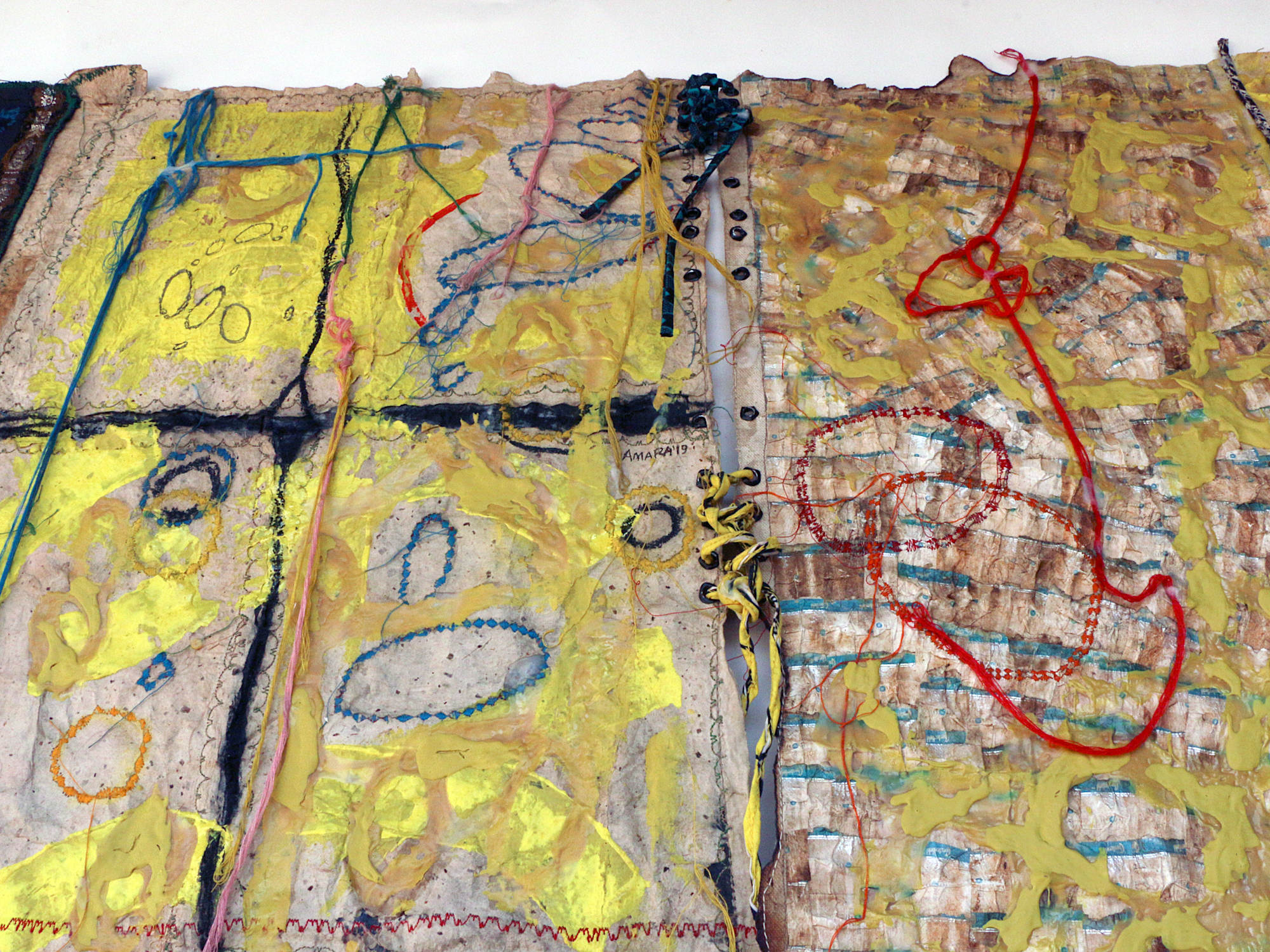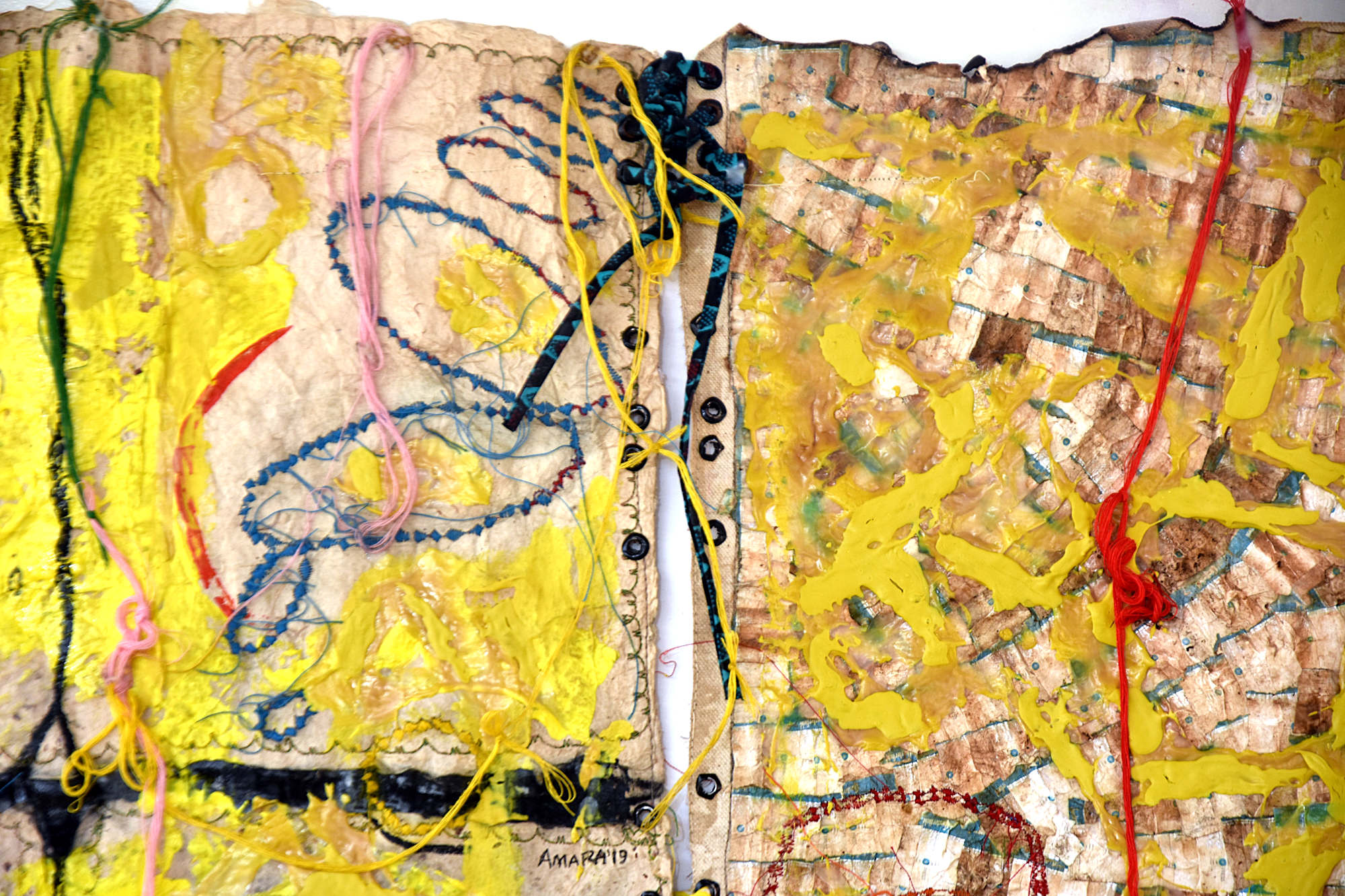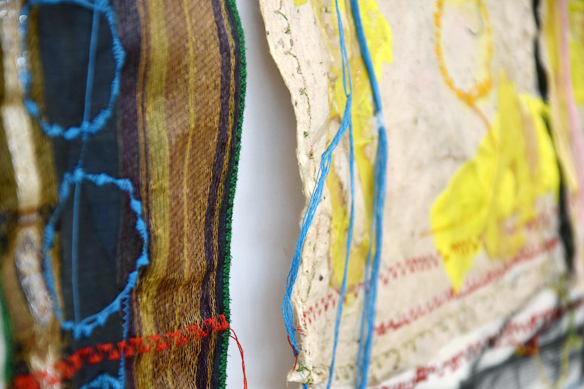 - Recovered cigarette filters (cork/tipping paper from smoked cigarettes), Adhesive, Stemspaper (handmade paper from local plants), Fabric, Pastel, Thread