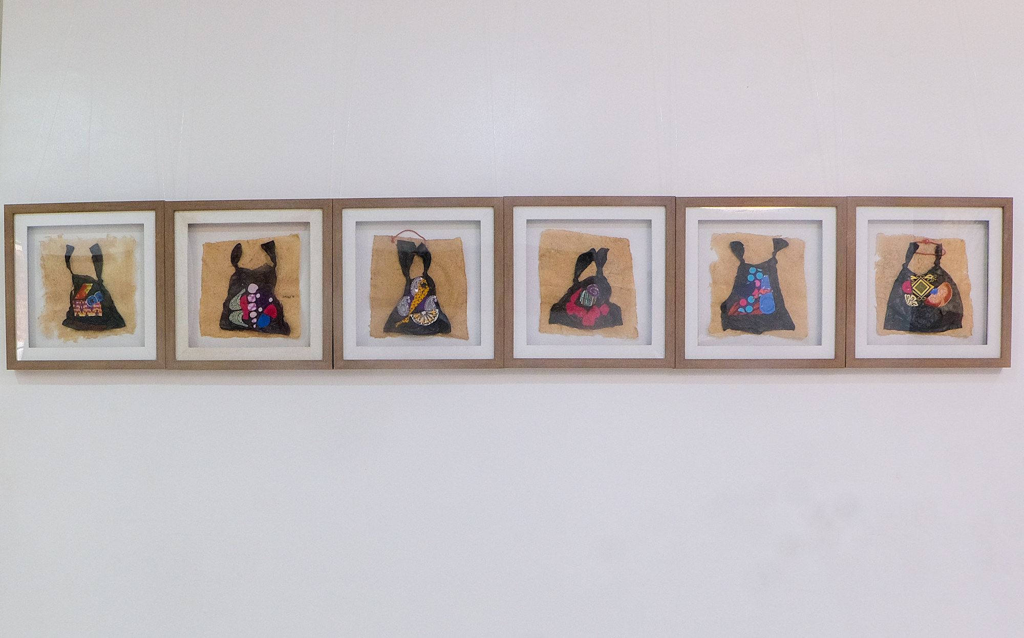 Fabric, Used Bags, Handmade paper (from fibres I processed from the stems of some local Nigerian plants.