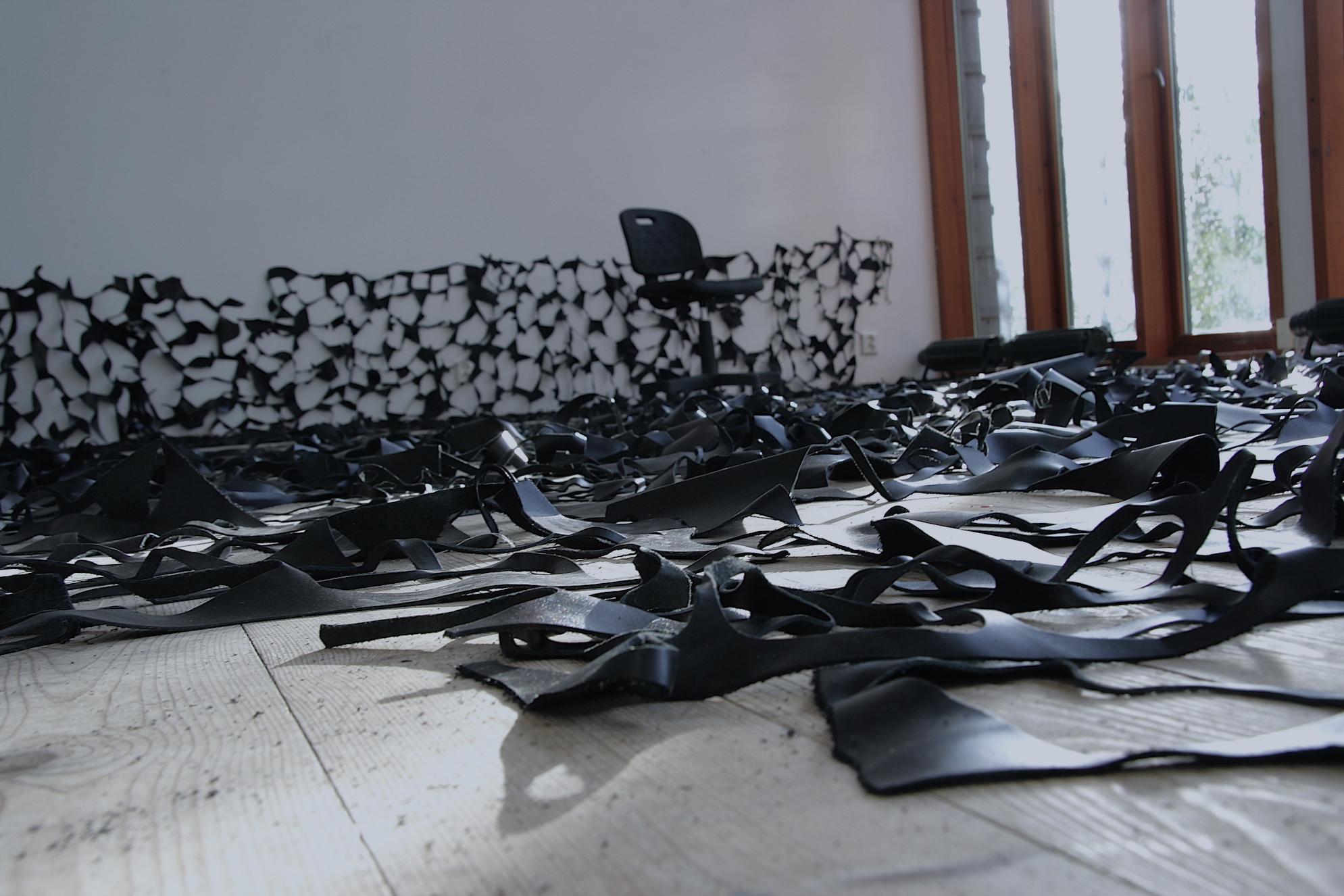 The material for work here, from which this idea has been drawn, and upon which it is laid, is a collection of offcuts (of leather) from a shoe factory in Norway. The majority had been torn out from sets of piles of skin; and the rest are (usually) cast off, pulled out of play, as they are no longer needed.