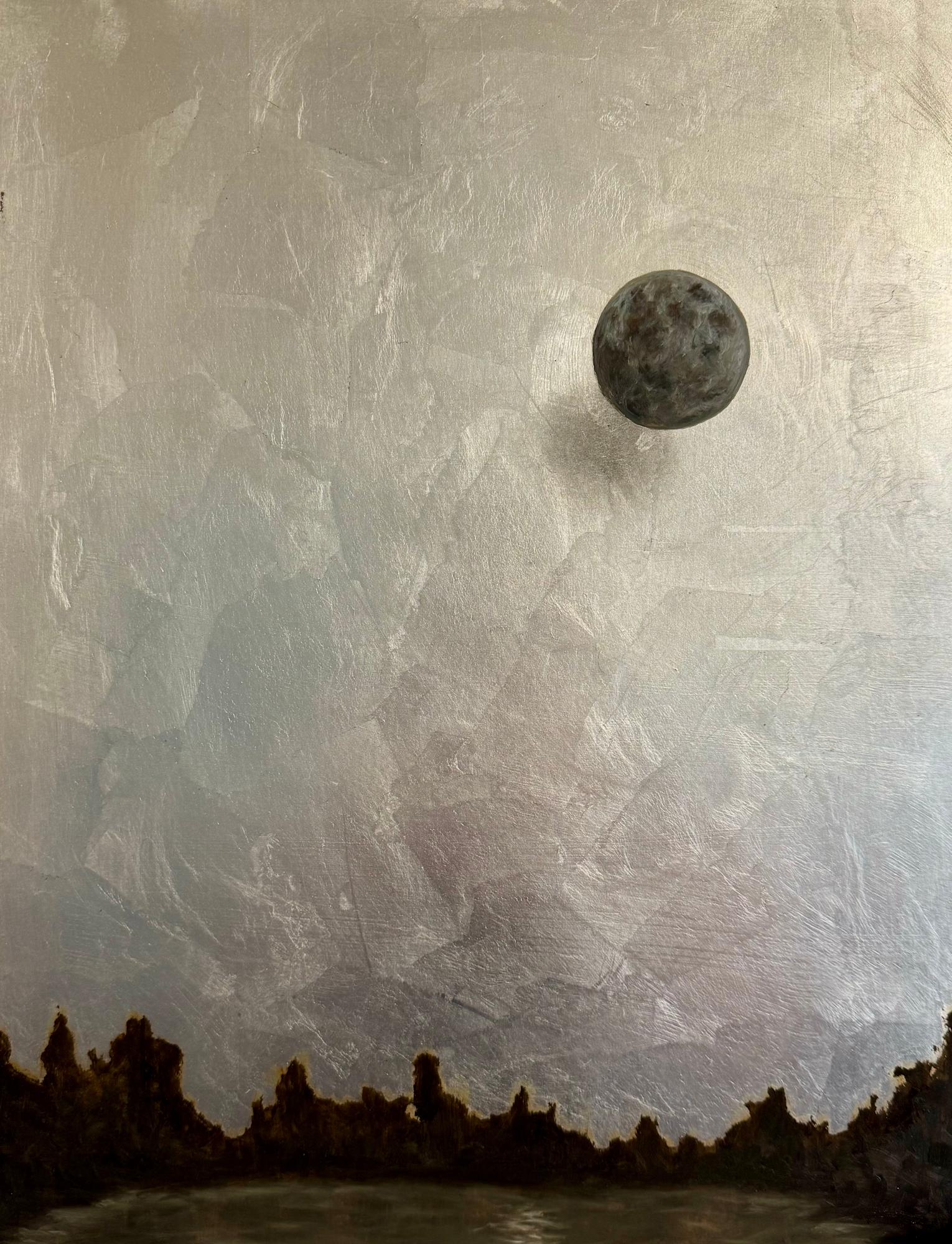 An otherwordly landscape of a moon resting on a silver sky. This painting is part of a pair (see Moon II).