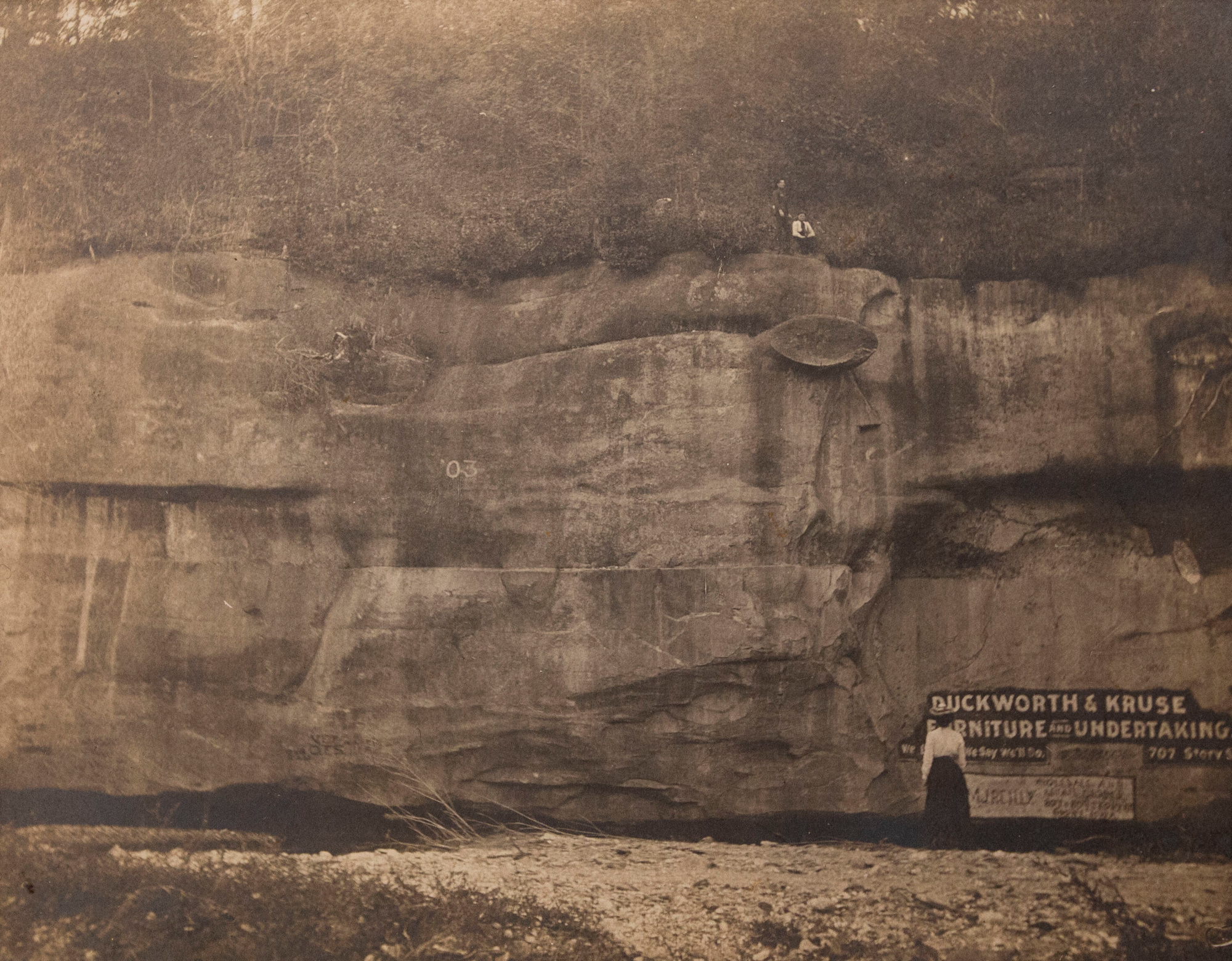 Depicts Ledges State Park canyon in Madrid, Iowa. The signs at lower right advertise a furniture and undertaking business owned by Buckworth & Kruse, 707 Story St., Boone, Iowa.