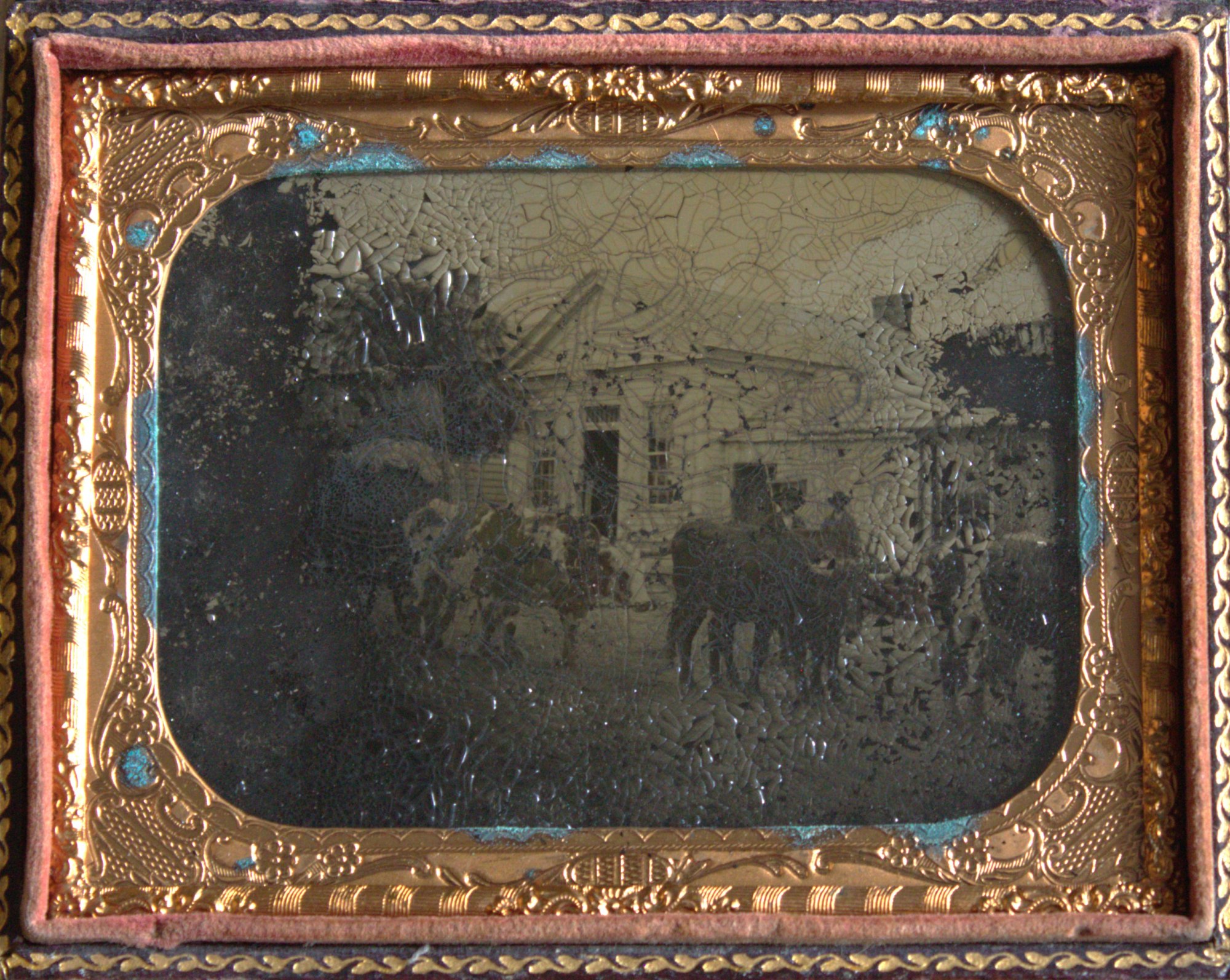 1/4 plate ambrotype depicting cows in front of a building.