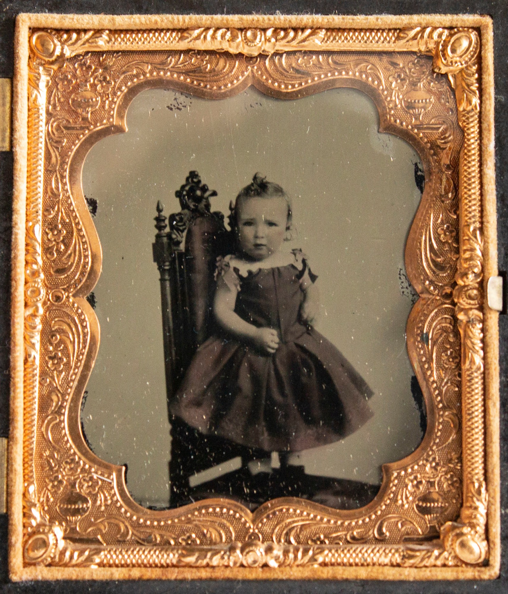 1/6 plate ambrotype depicting child standing on chair. Floral mat with thermoplastic case.