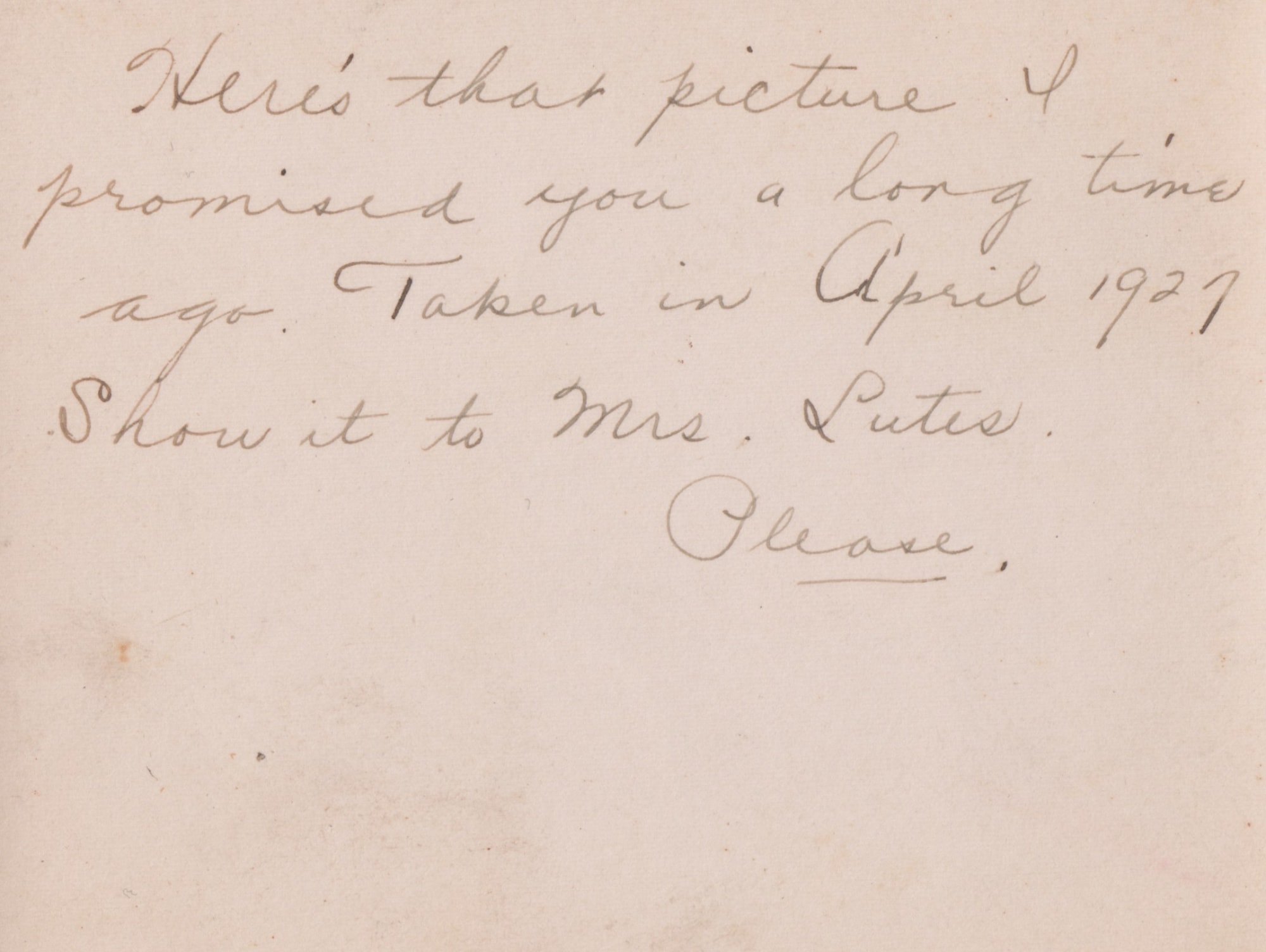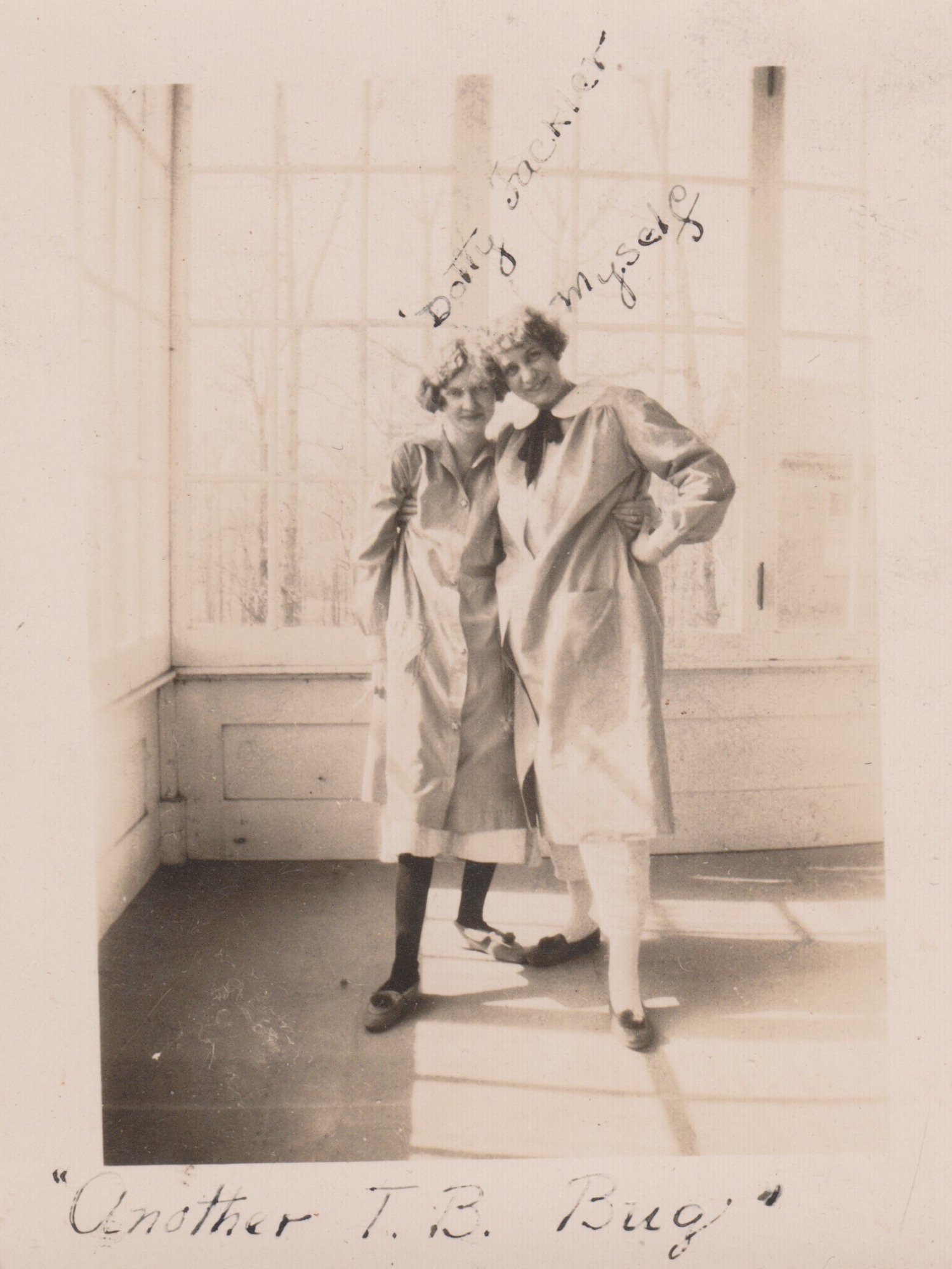 Depicts two smiling young women wearing smocks and standing arm in arm within a sleeping porch, presumably at a tuberculosis sanitarium. Dotty Fackler died of complications in November 1927. This photo was taken in April 1927.