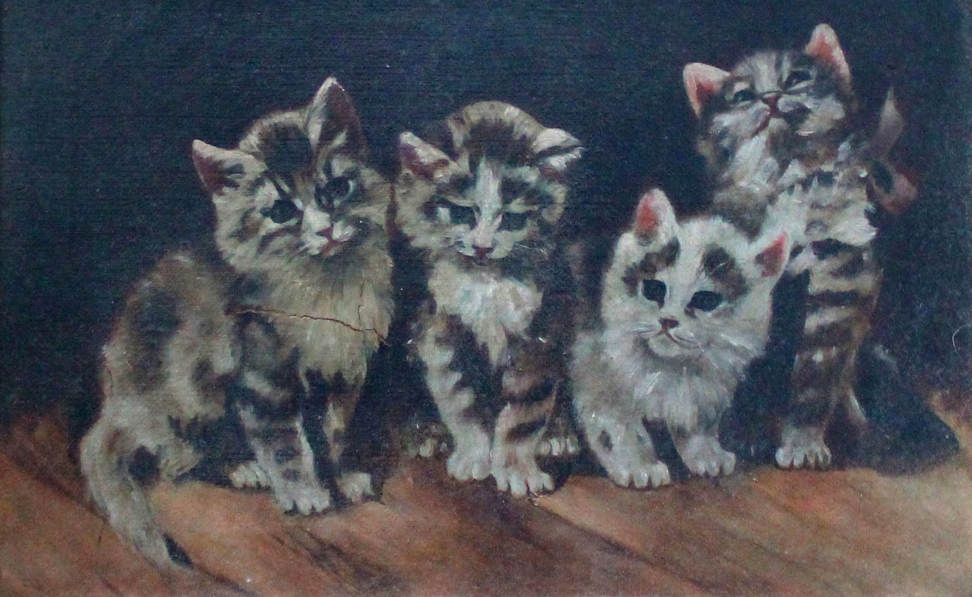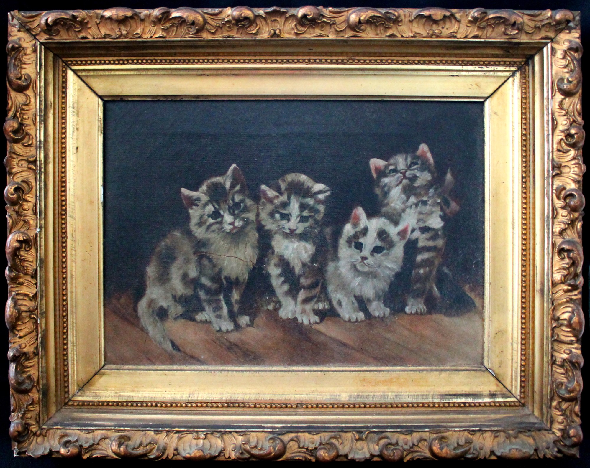 After Julius Adam II, painting depicts the cats in his artwork "Four Little Scamps Are We." Label on the back of the frame is from Gouverneur, New York. The frame maker was also the funeral director.