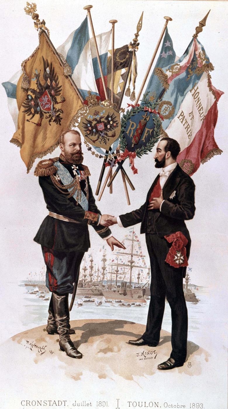 Pressed glass bottle depicting French admiral and diplomat Alfred-Albert Gervais at the top. Beneath and to the right is Sadi Carnot, president of France from 1887 until 1894. To the left of Carnot is Russian emperor Alexander III. The bottle commemorates the Kronstadt naval visit of July 1891, at which France and Russia formed an alliance.