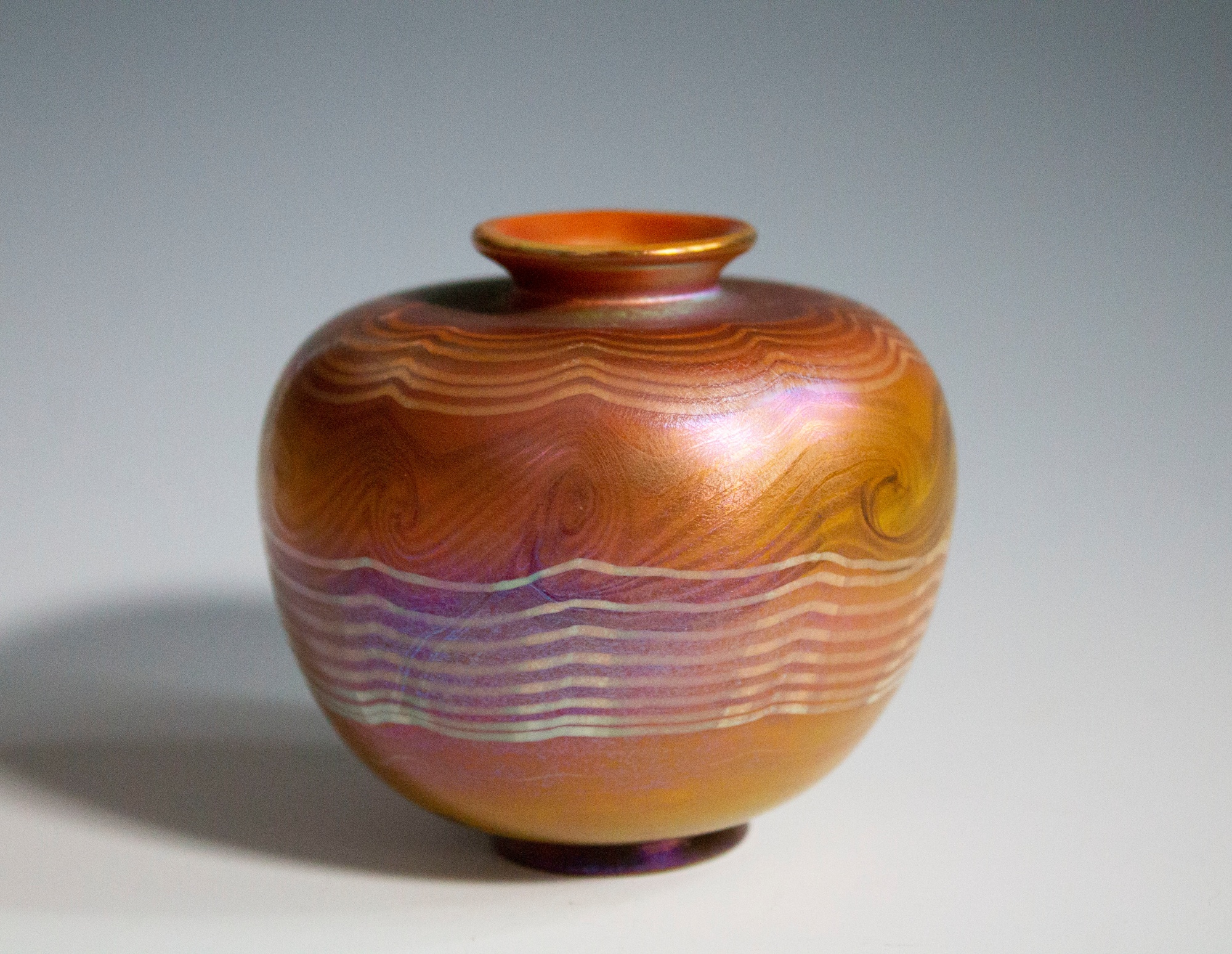 Tiffany Glass & Decorating Co. cabinet vase with gold base color and pulled feather decoration with blue damascene-like striations.