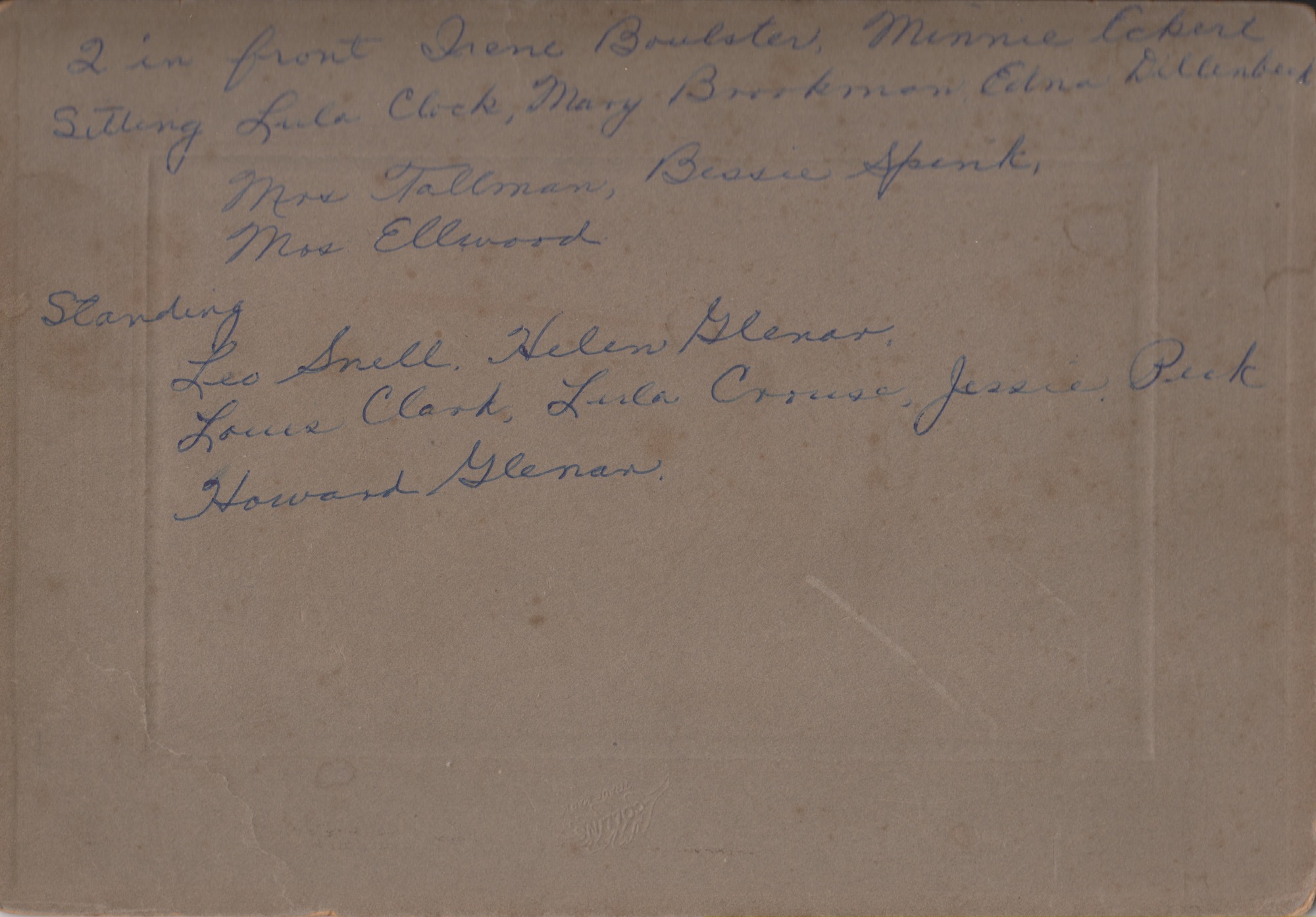 Seated: Lula Clock, Mary Brookman, Edna Dillenbeck, Mrs. Tallman, Bessie Spink, Mrs. Ellwood