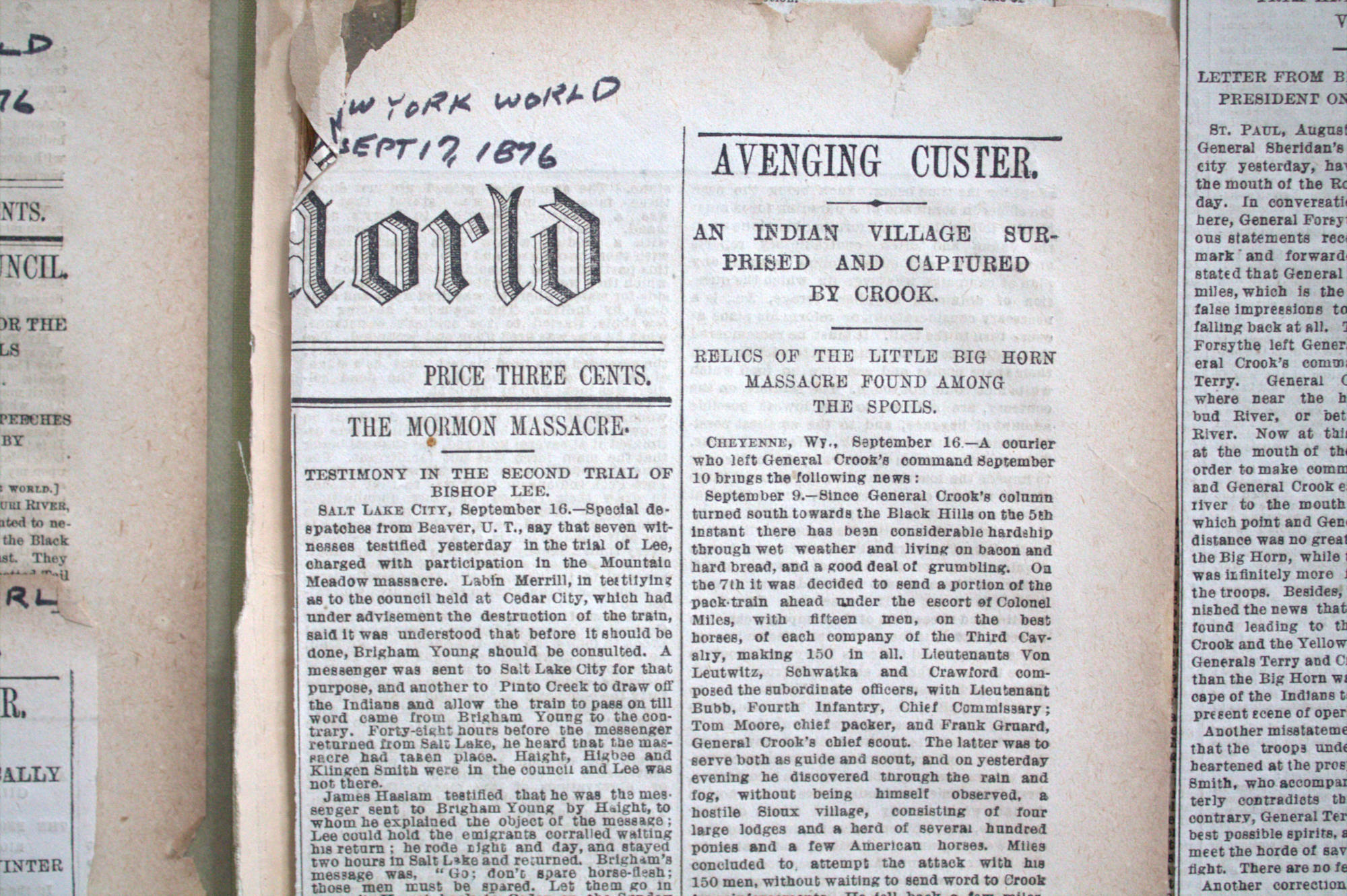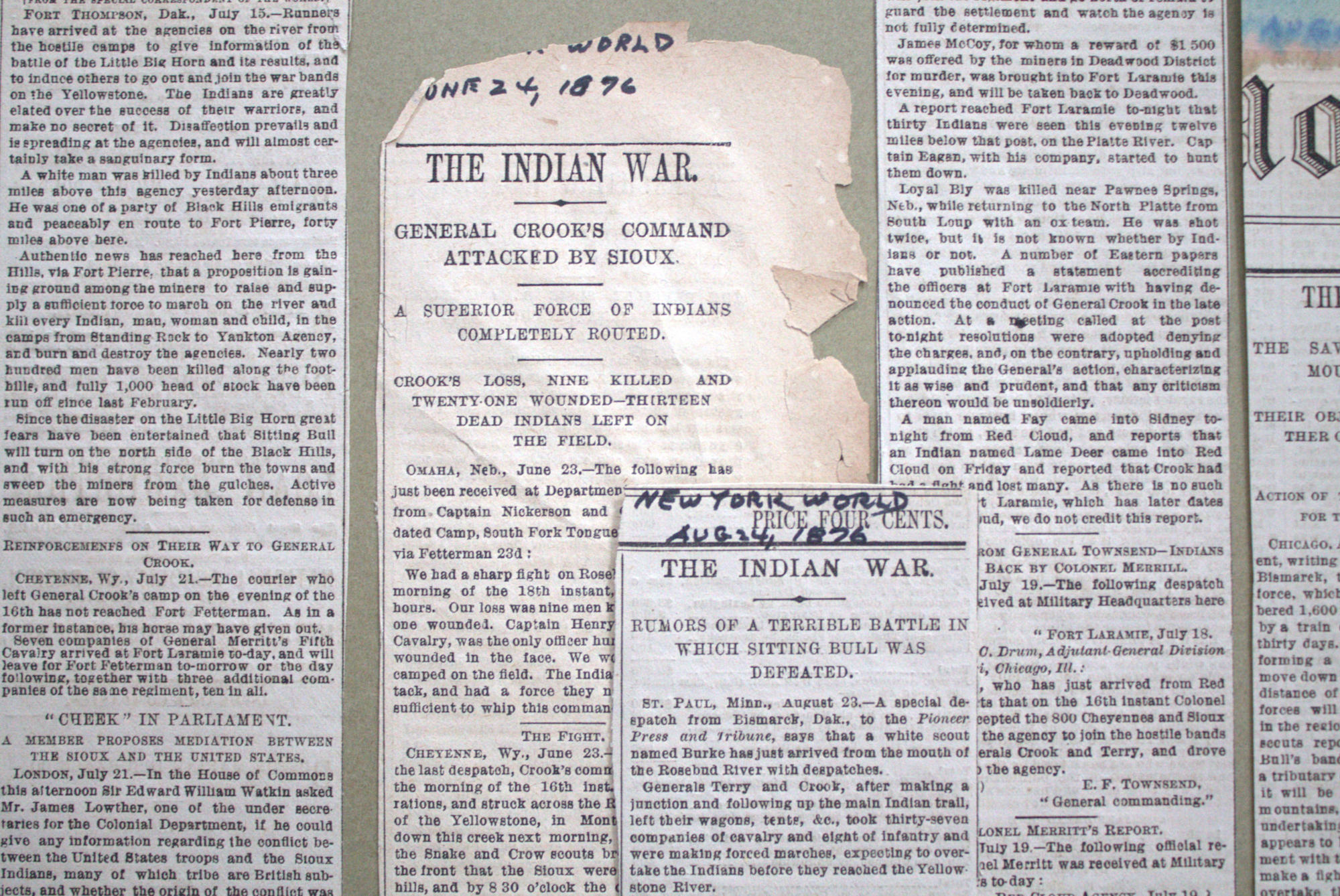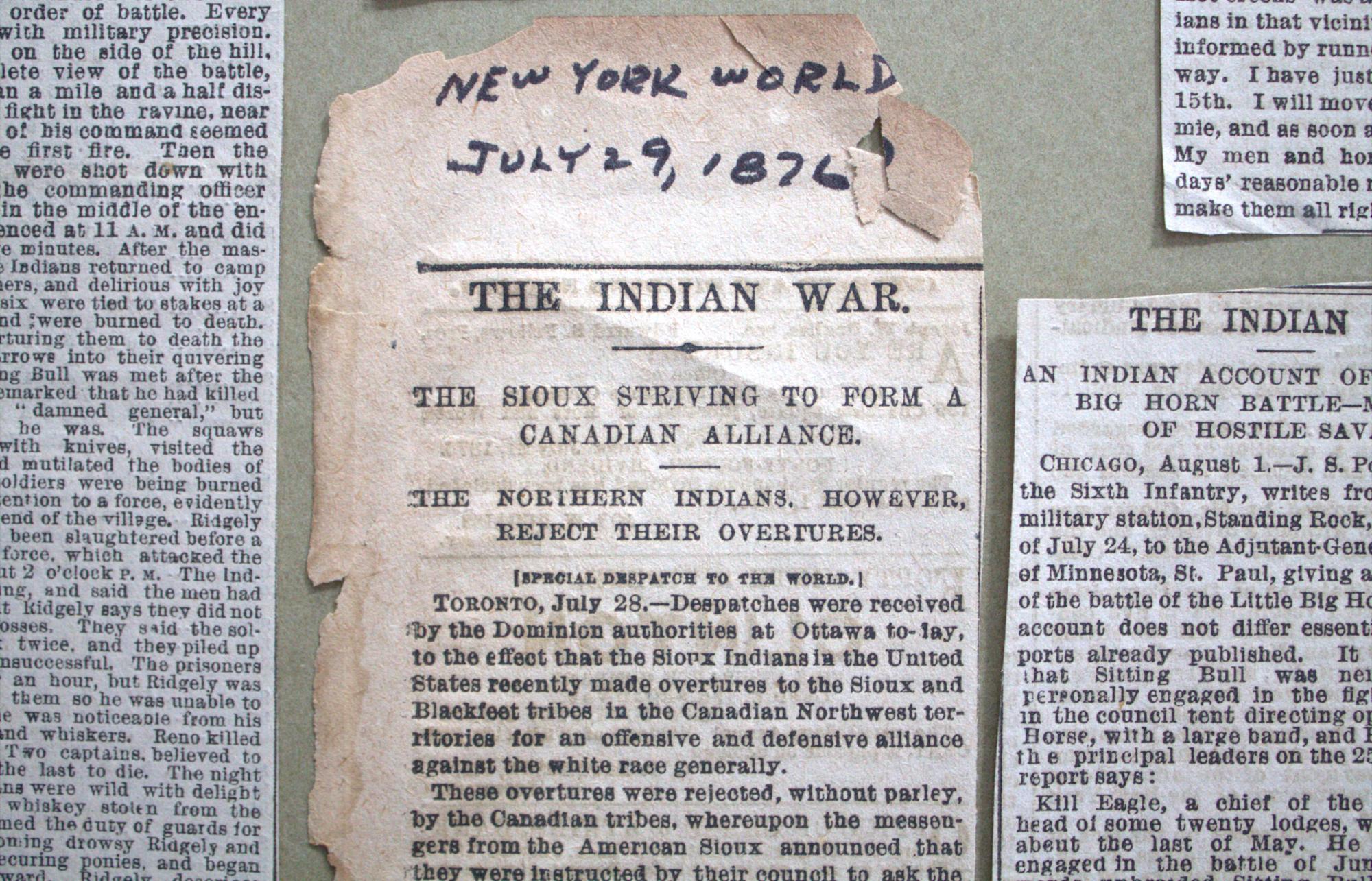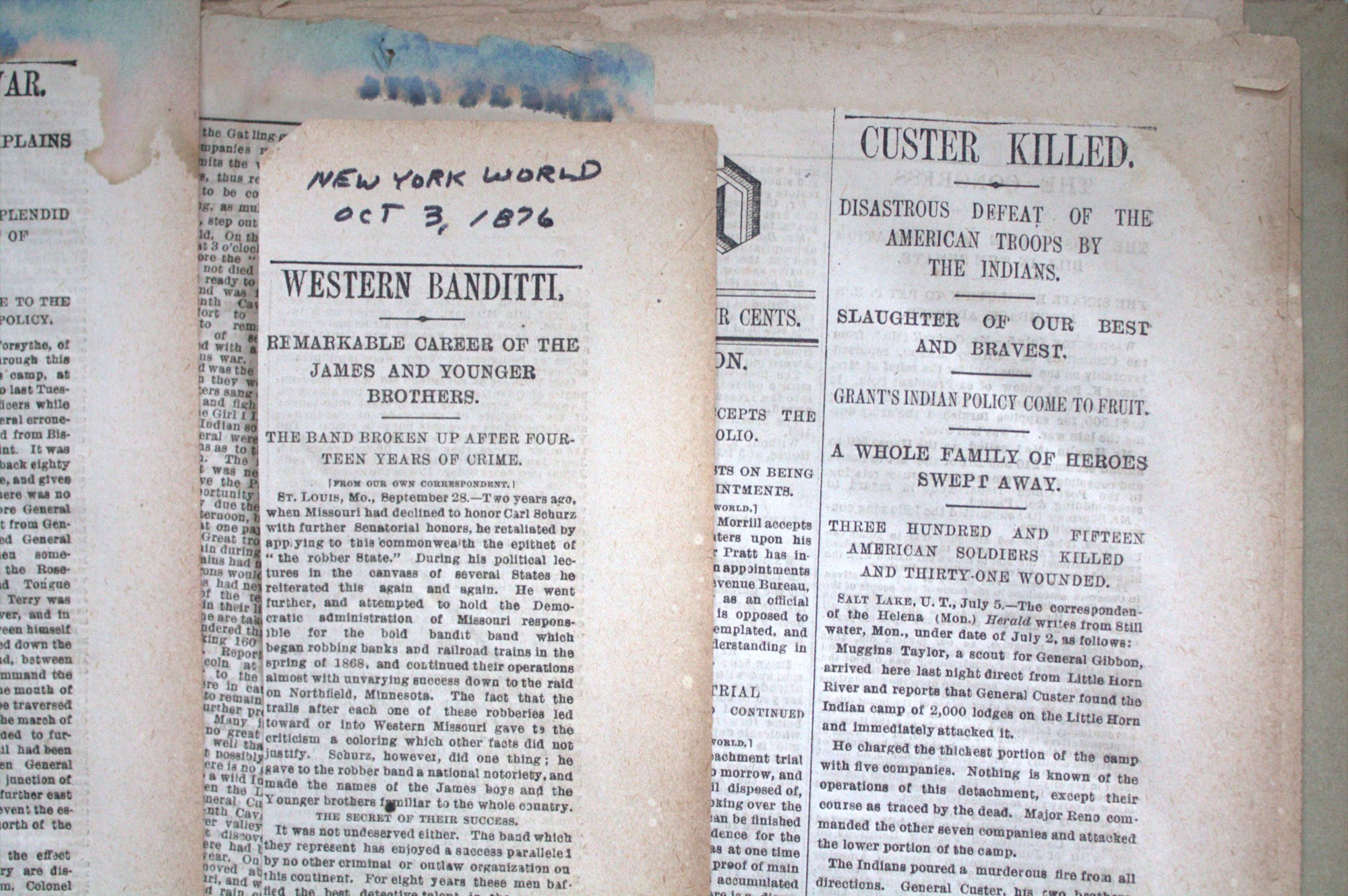Large portfolio filled with period newspaper clippings pertaining to the killing of George Armstrong Custer. Additional articles relate to the Indian war and western outlaws such as Jesse James .