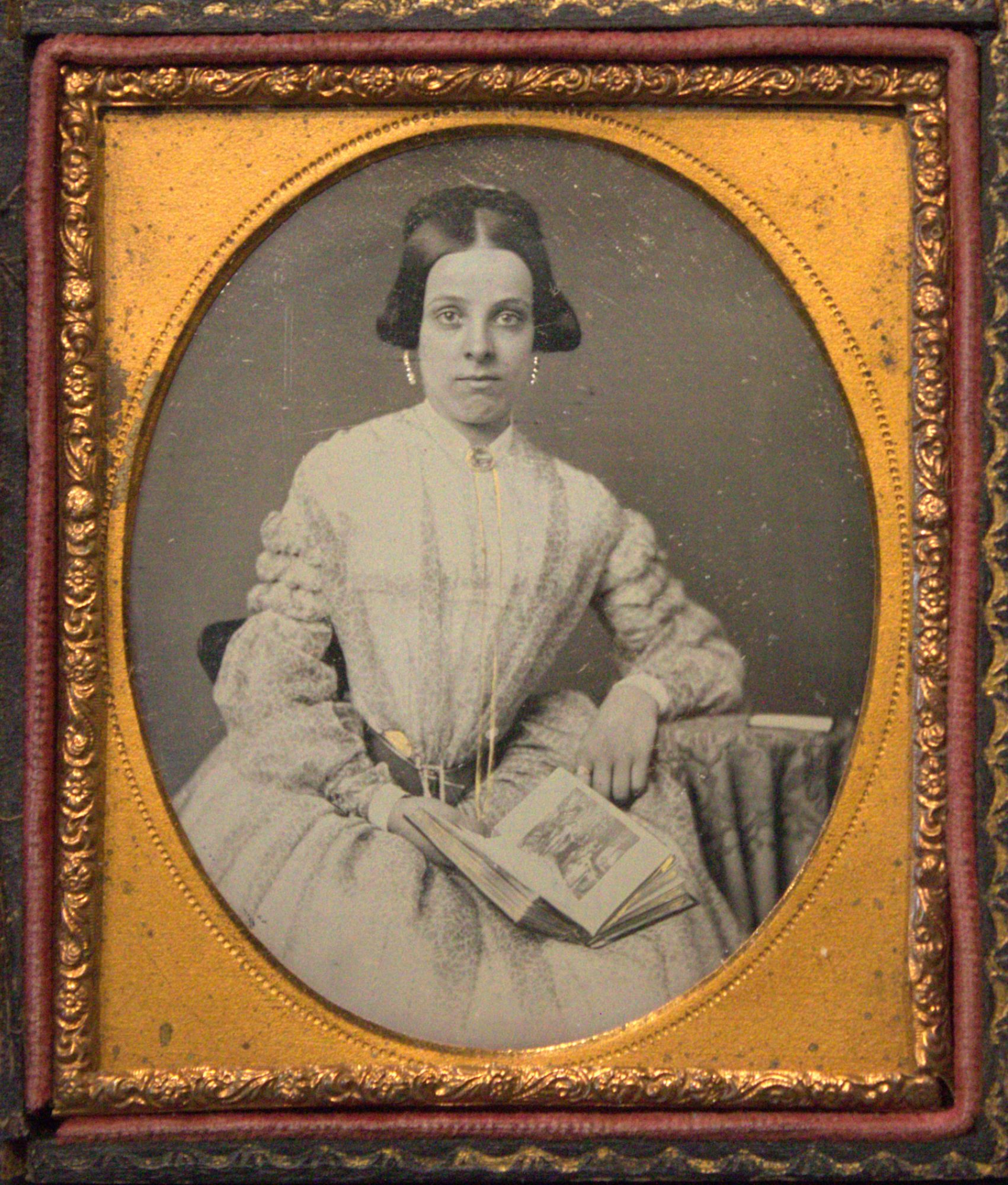 1/6 plate daguerreotype depicting a surprised, elegantly-dressed woman holding a book open to an illustrated page.
