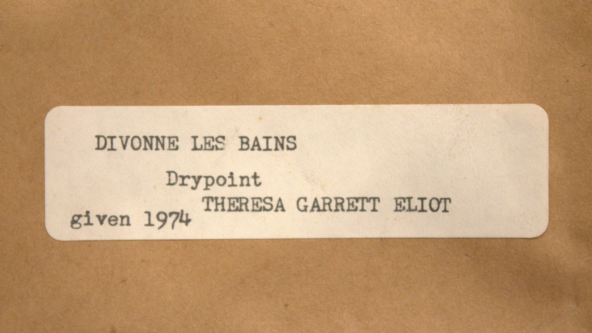 - Signature: Recto, bottom margin (pencil): 'Divonne les Bains / T. Garrett Eliot' Verso (adhesive label): 'DIVONNE LES BAINS / Drypoint / THERESA GARRETT ELIOT / given 1974'