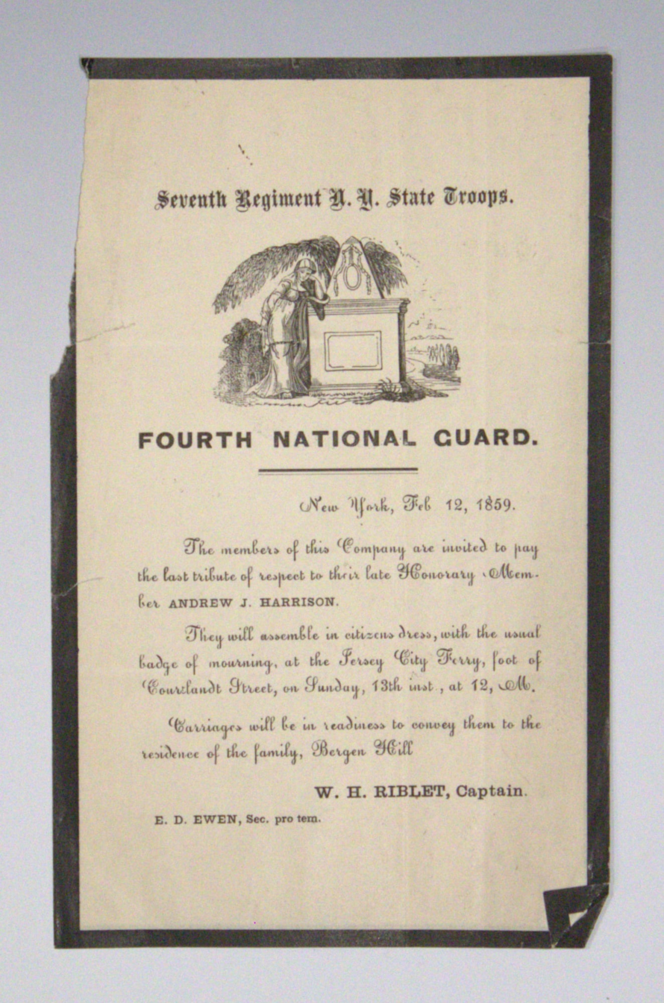 Funeral notice for the death of Andrew J. Harrison of the fourth company of the Seventh Regiment of New York.