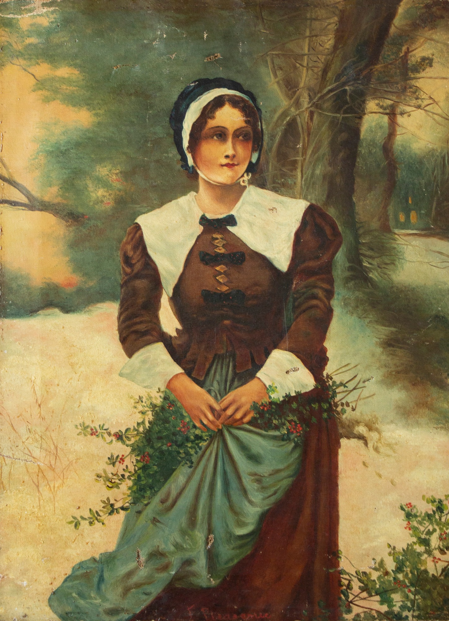 Based on Edward Percy Moran's "A Fair Puritan," c.1897.