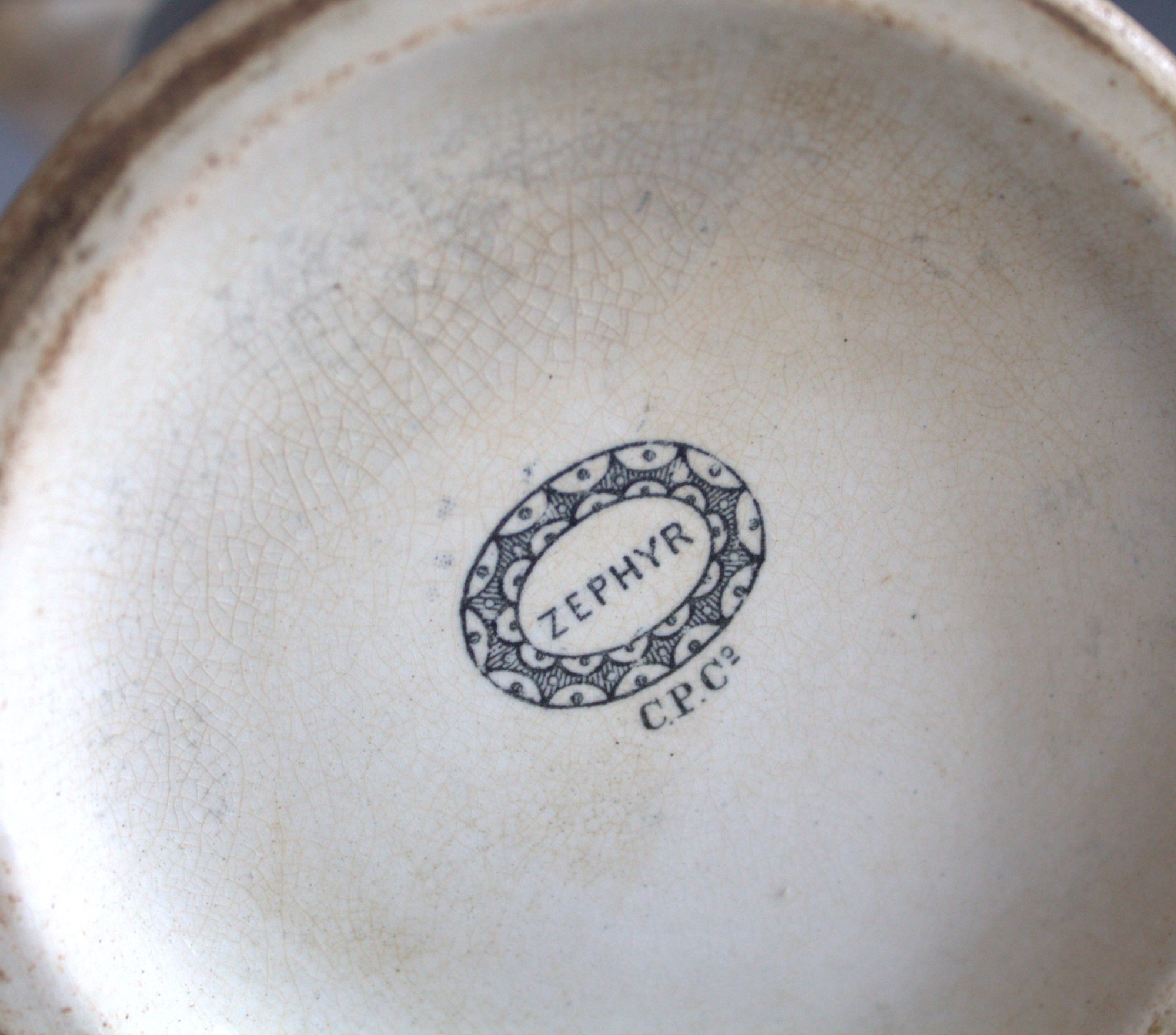 - Signature: Underside (underglaze stamp): 'ZEPHYR / C.P.Co.'