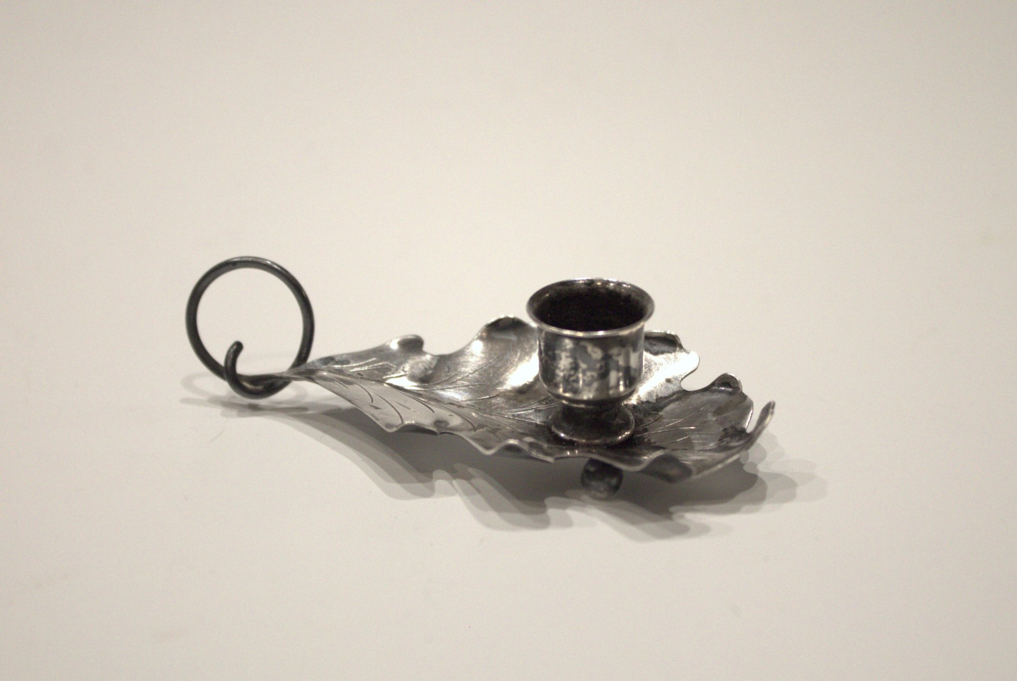 Miniature silver candle holder in the shape of an oak leaf. Possibly for a child, doll, or table place setting.