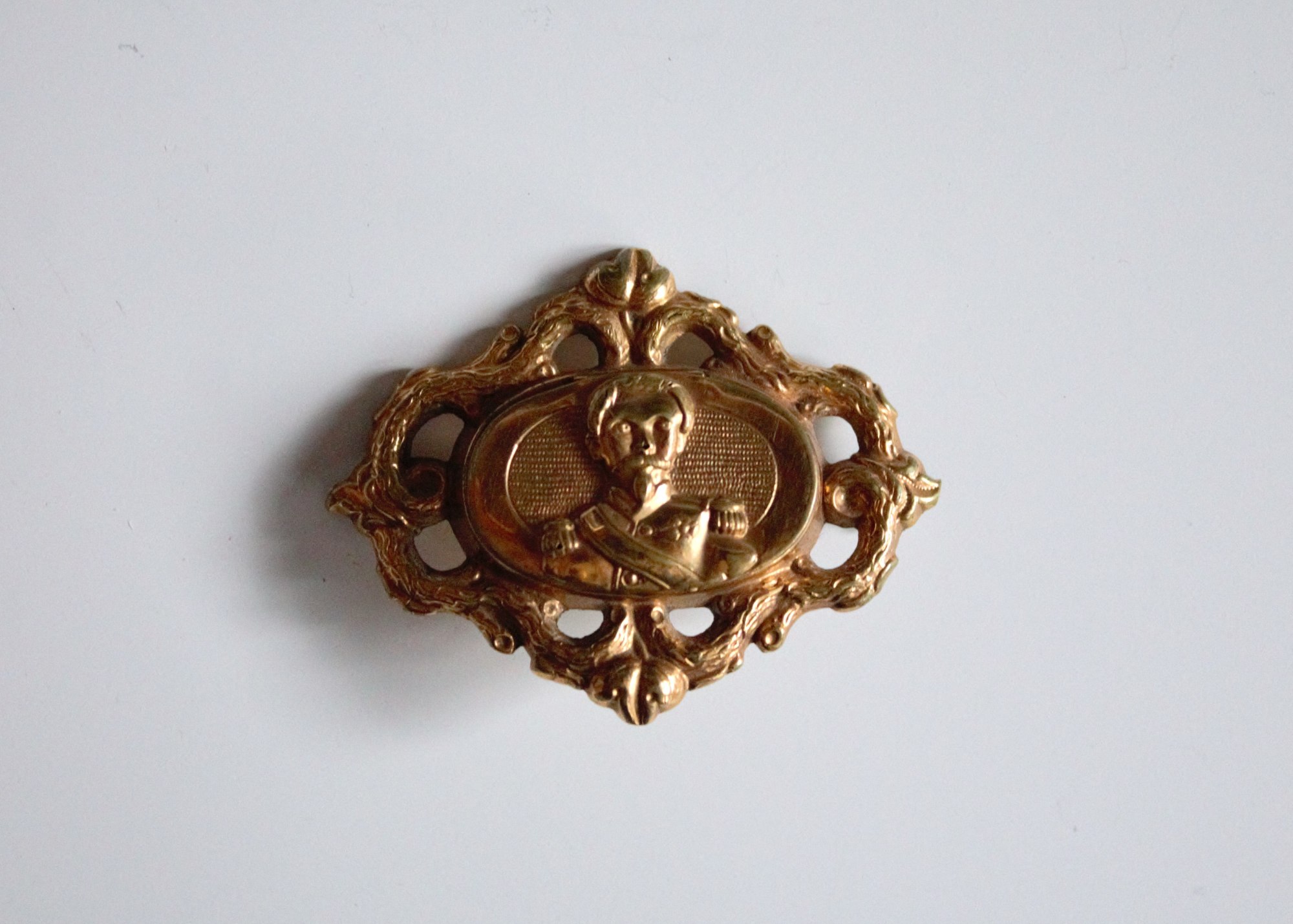 Gold-filled mourning brooch depicting a soldier. Hinged compartment is intended to hold a lock of hair.