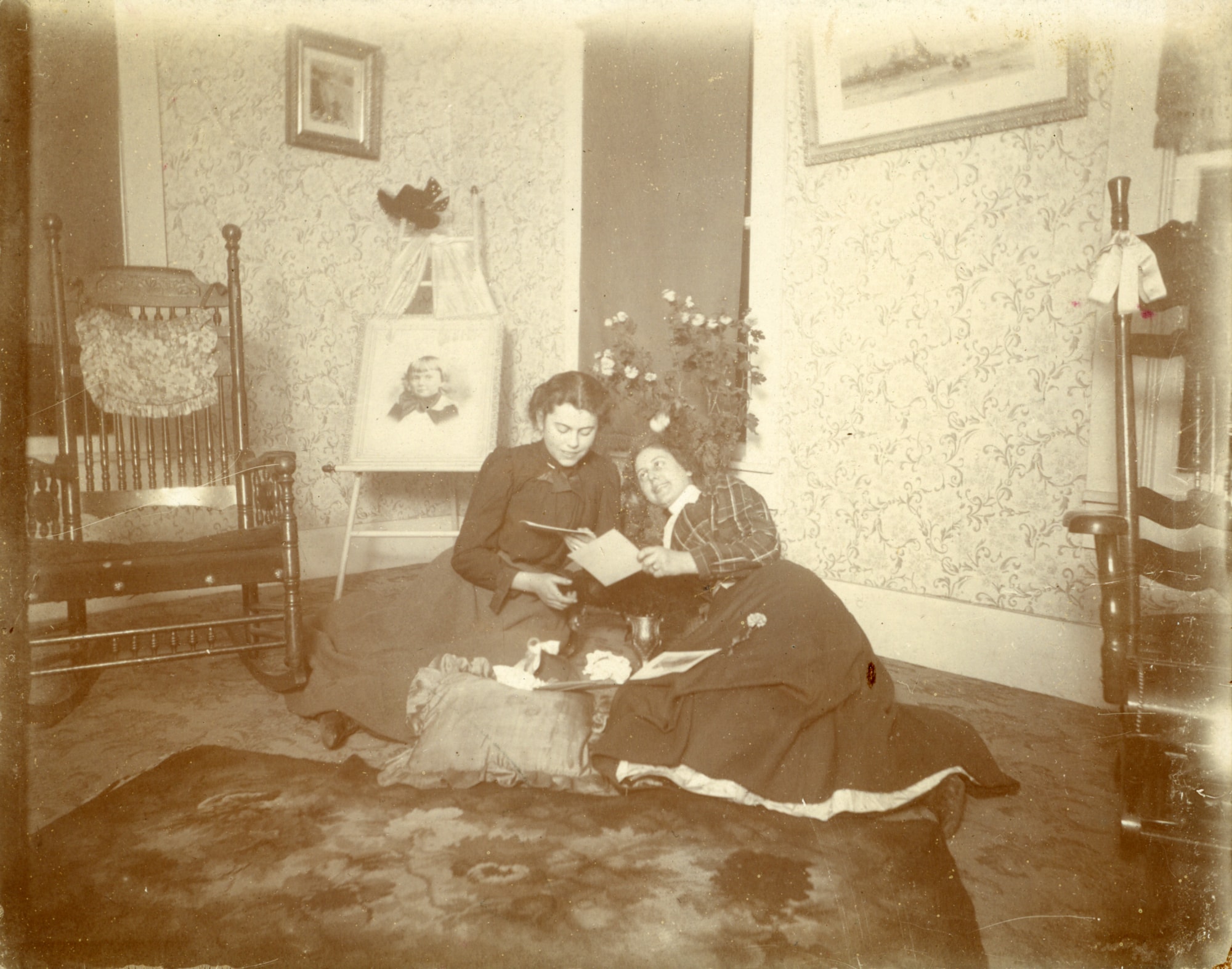 Depicts two girls looking at photographs on the floor in the parlor of a private residence. Verso says: "Taken by father of Barbara Wadsworth Williams."