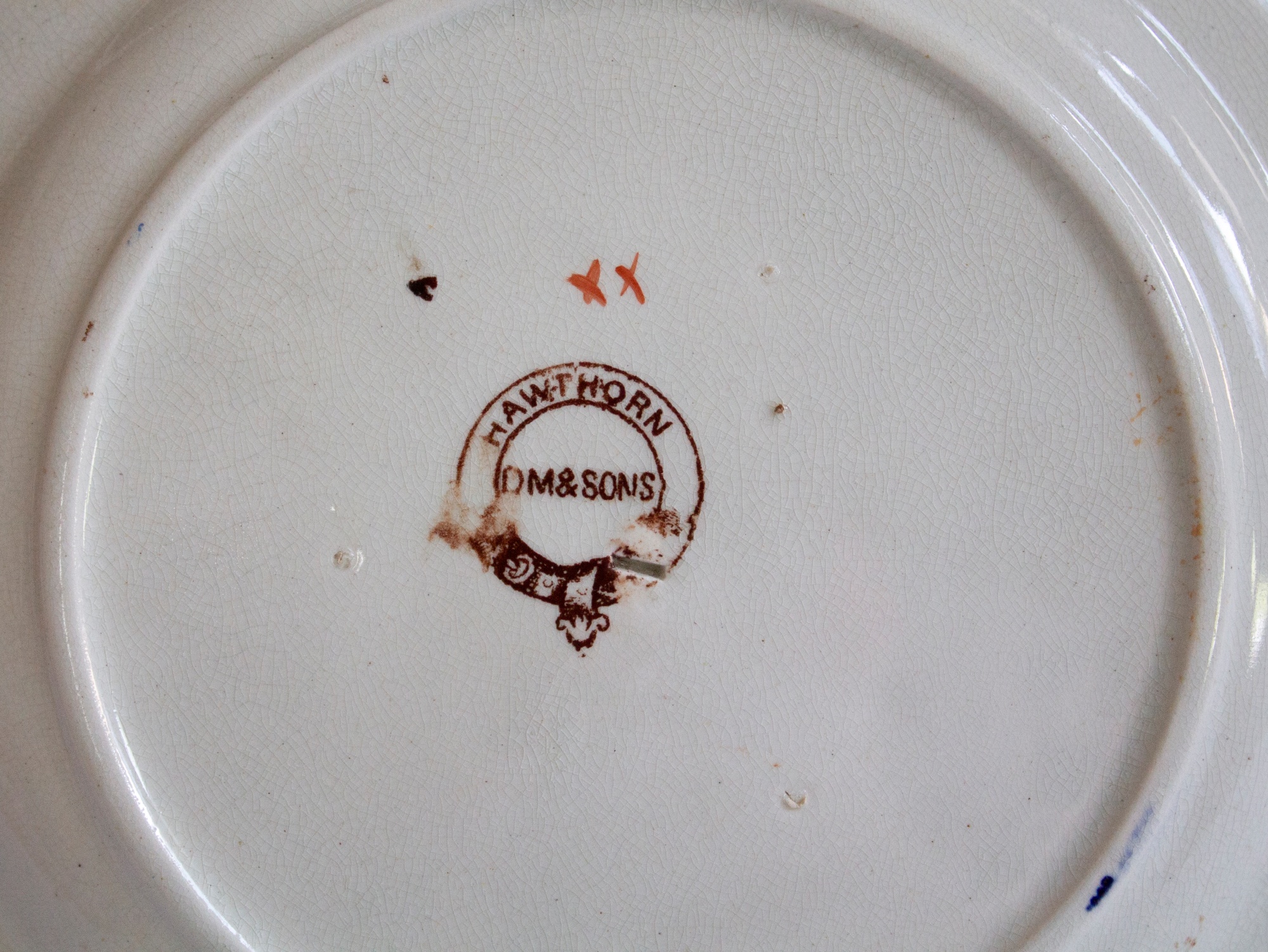 Aesthetic transferware plate with red, green, blue, and luster decoration.