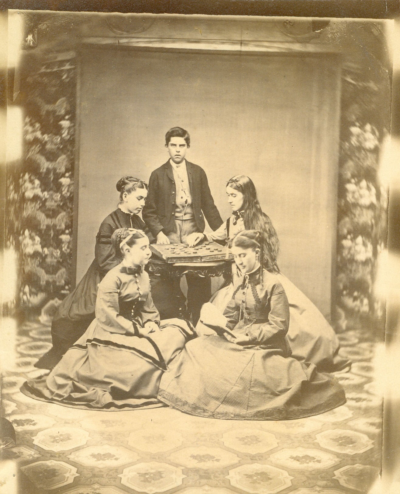 Group portrait depicting four girls and a boy around a table with a game of checkers. Photo backdrop is noticeably set up inside a room with wallpaper and carpeting.