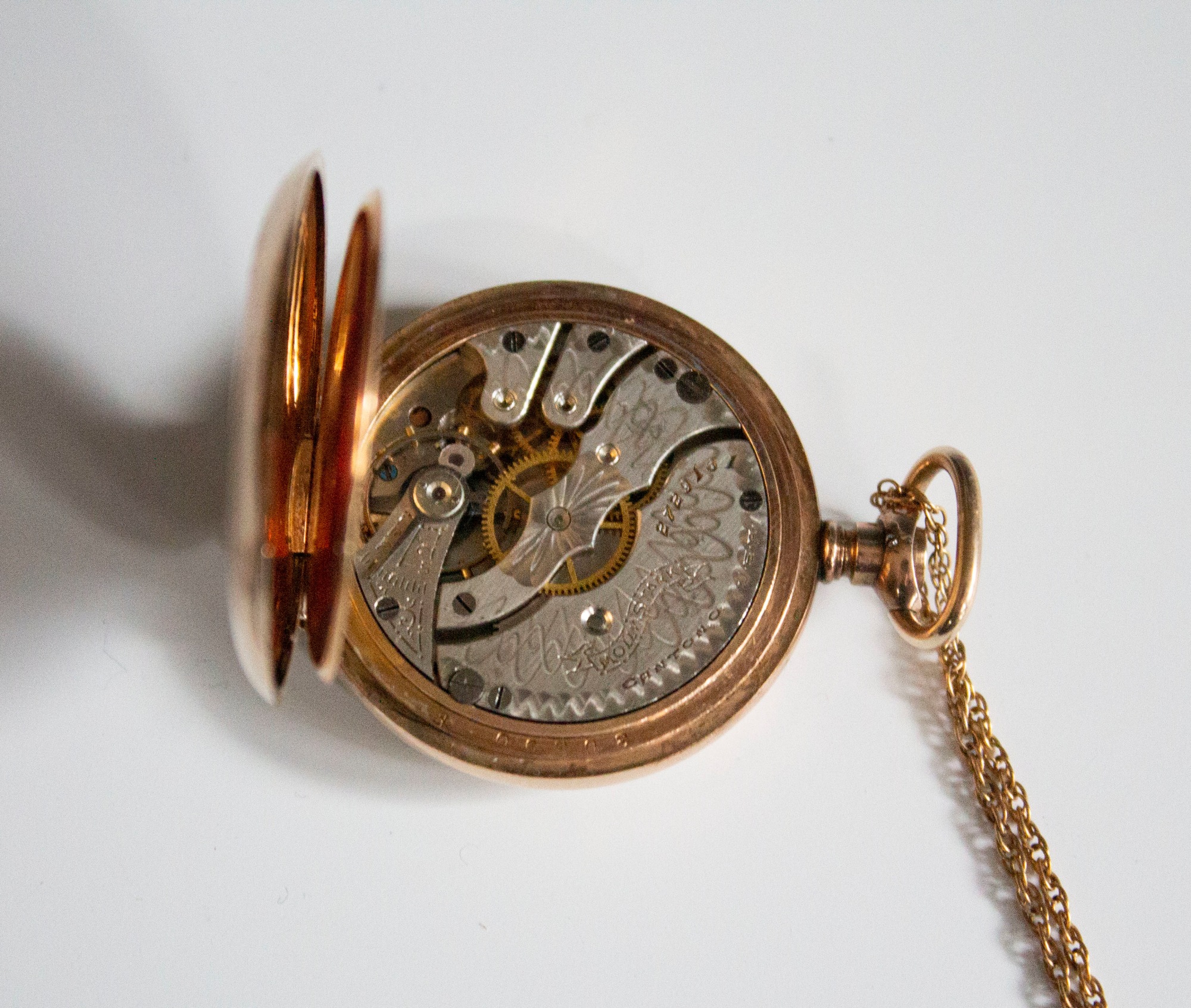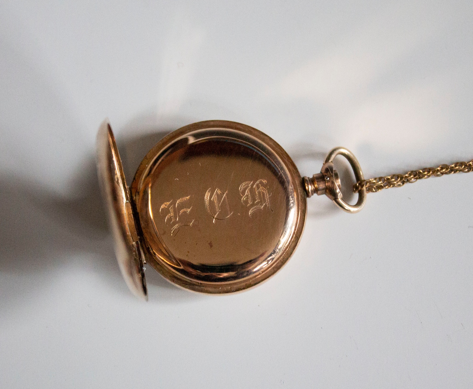 Hampden "Molly Stark" Canton, Ohio lady's pocket watch in a gold-filled Dueber case with engraved aesthetic house scene and monogram E.G.H.