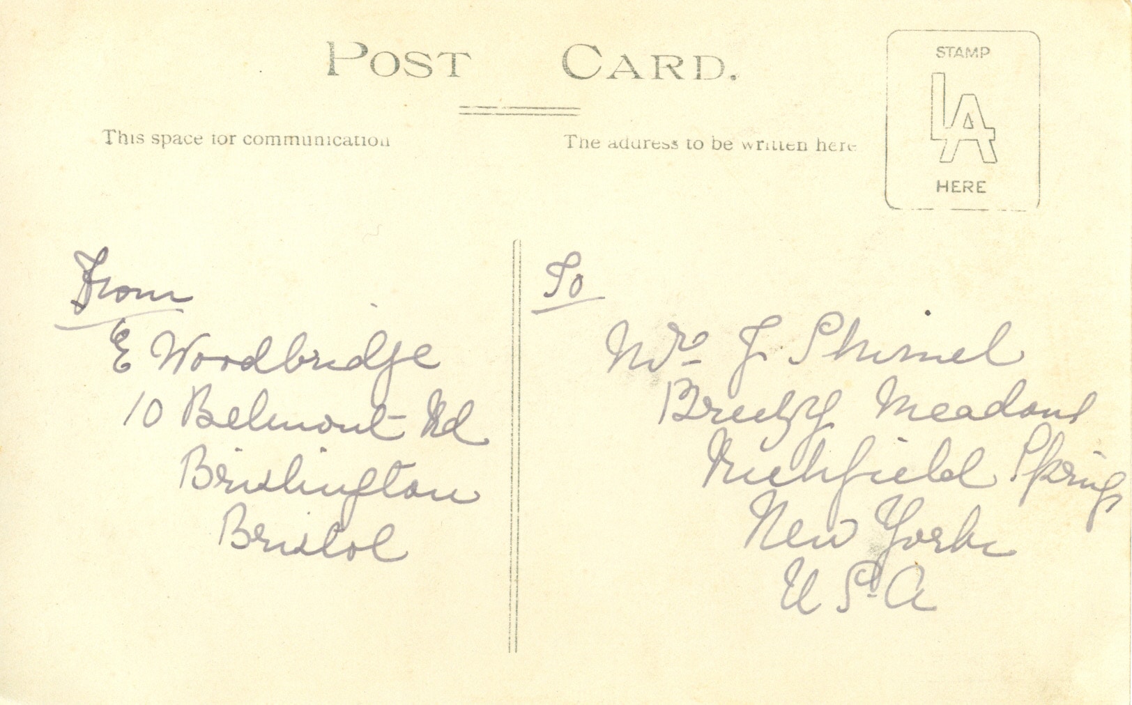 Postcard is addressed to Mrs. J. (Cora Firman) Shimel of Richfield Springs, New York.