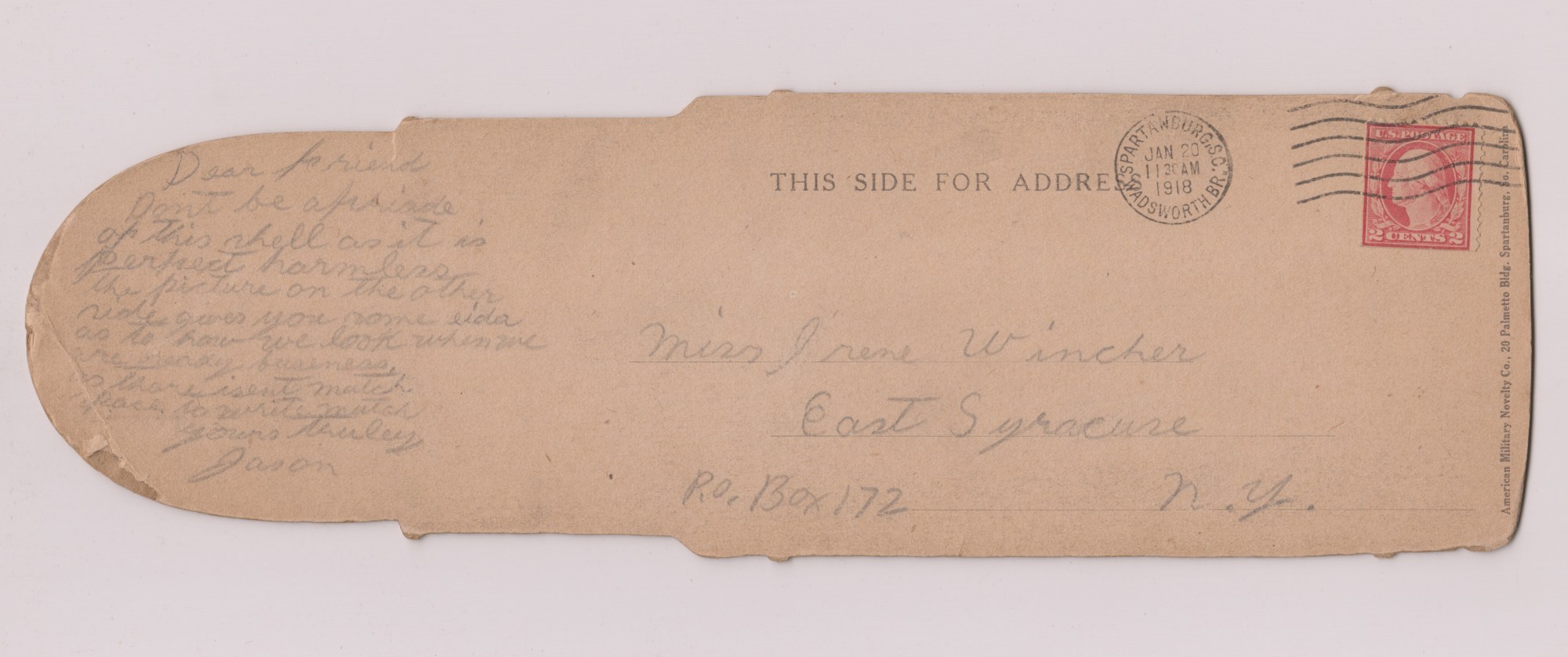 World War I bullet-shaped postcard addressed to Miss Irene Wincher of East Syracuse, New York.