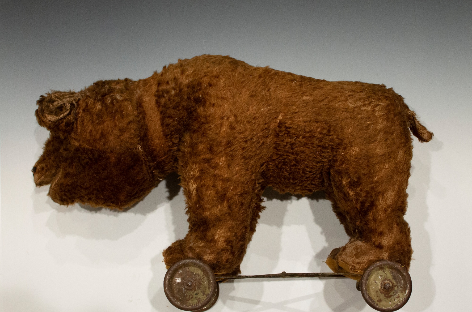 Mohair bear stuffed with excelsior and mounted onto metal wheels. Large enough that a child could ride the bear. Was probably a pull toy, but the collar is now missing.