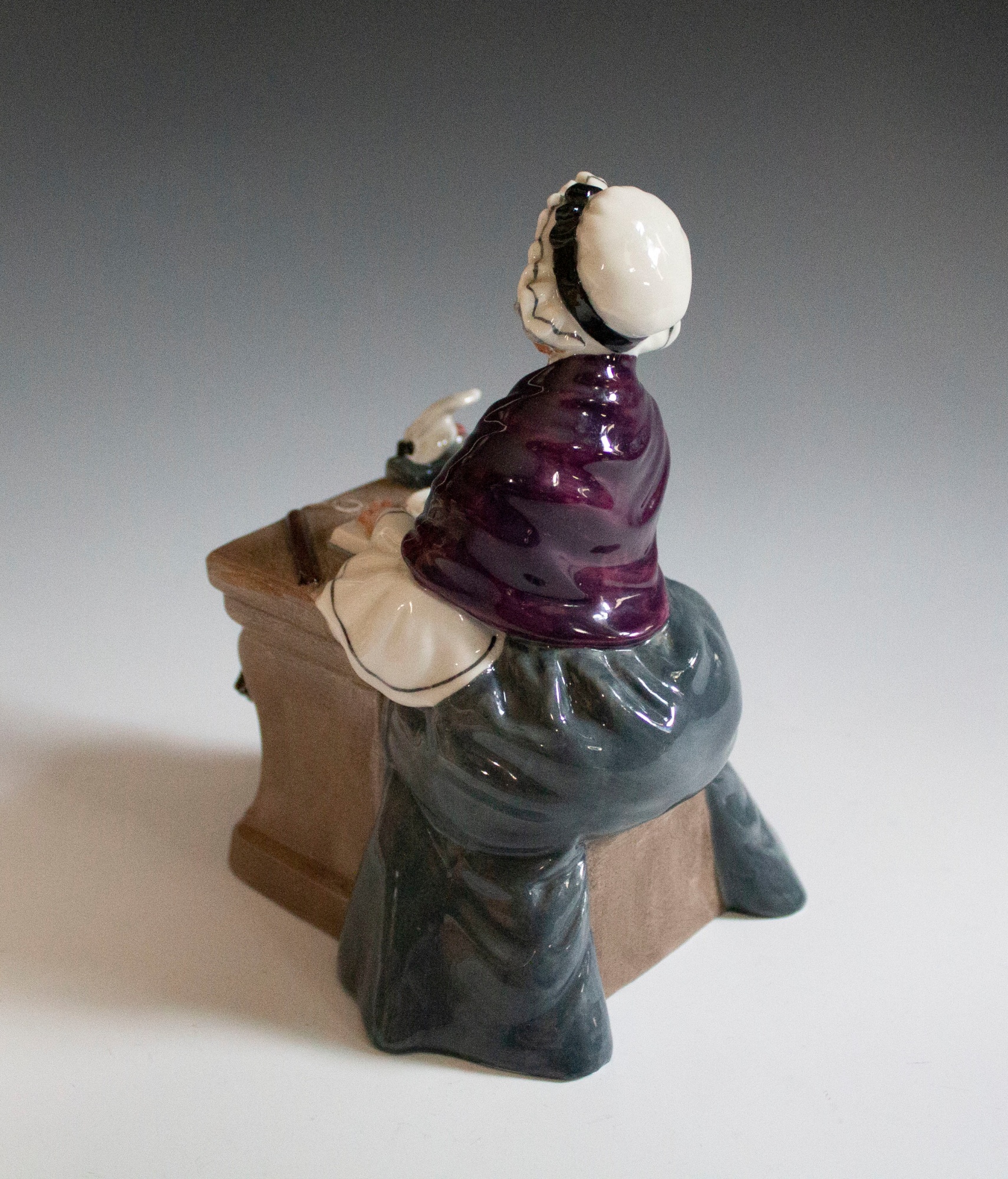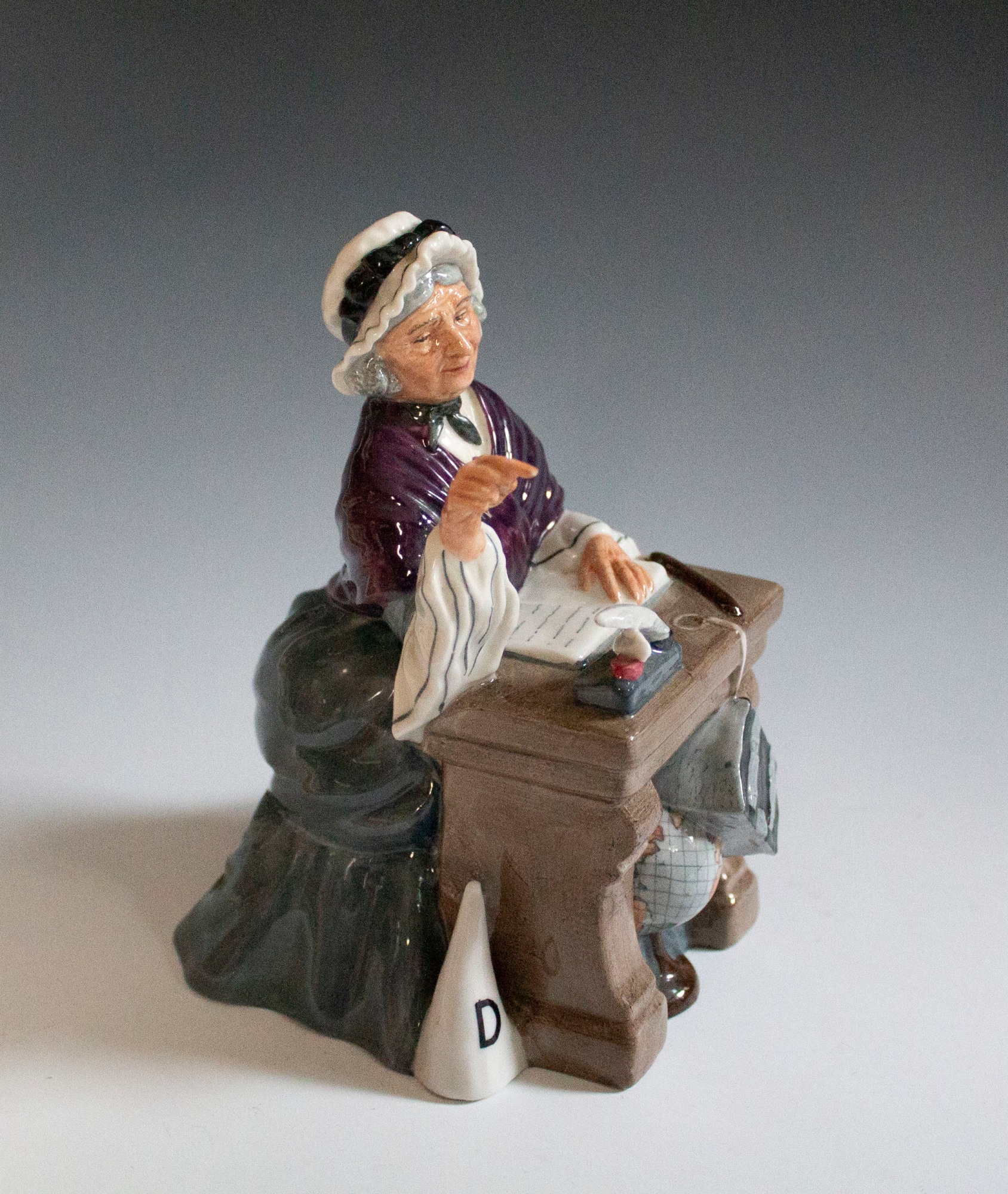 Figurine depicting an old spinster teacher sitting at her desk presumably lecturing a student.