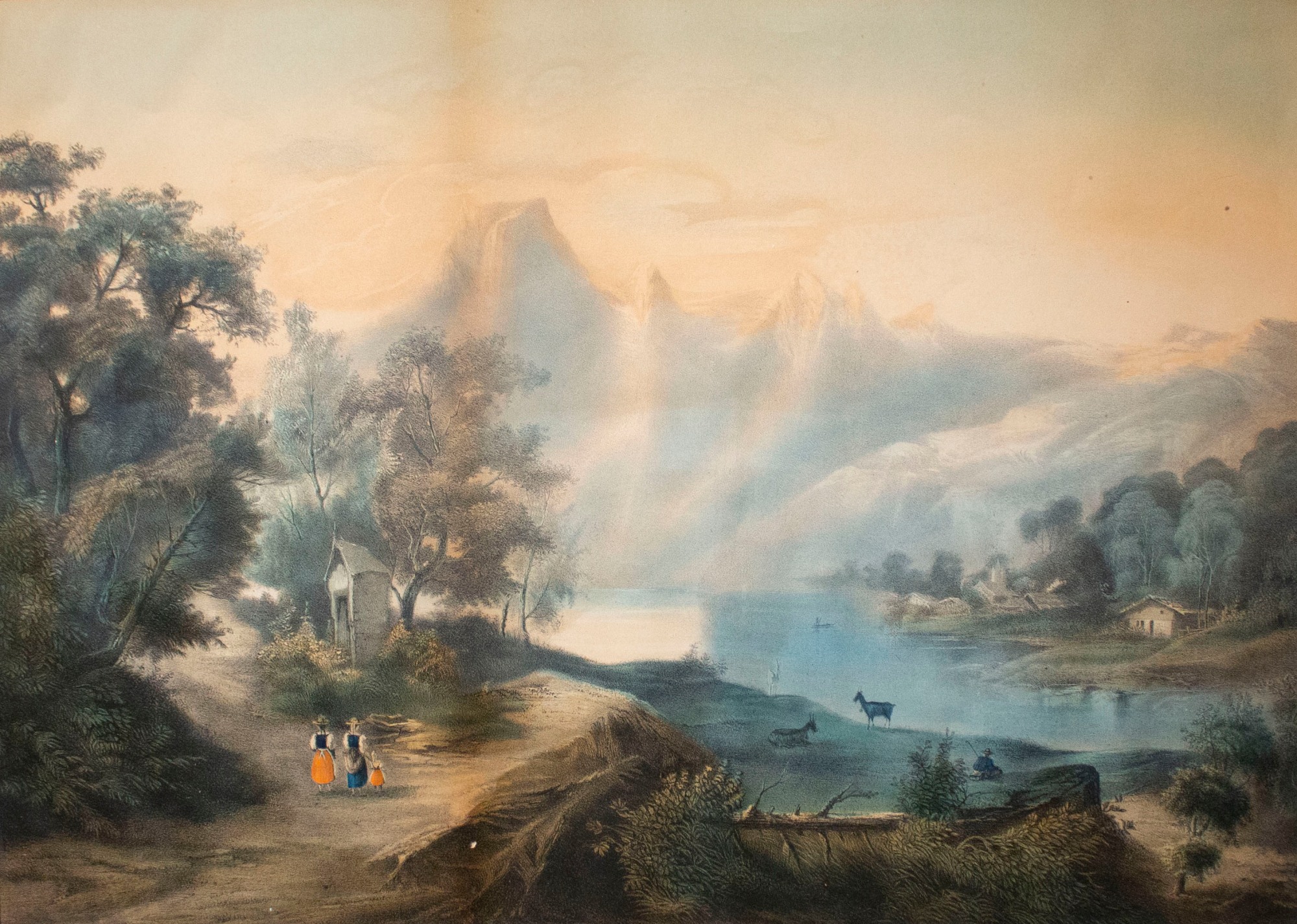 Lithograph with faux wooden printed border and hand coloring depicting the Walensee in Switzerland. Title is misspelled to say "Wallenlake," implying that the source of the print was not Switzerland. Original gilt and walnut frame.